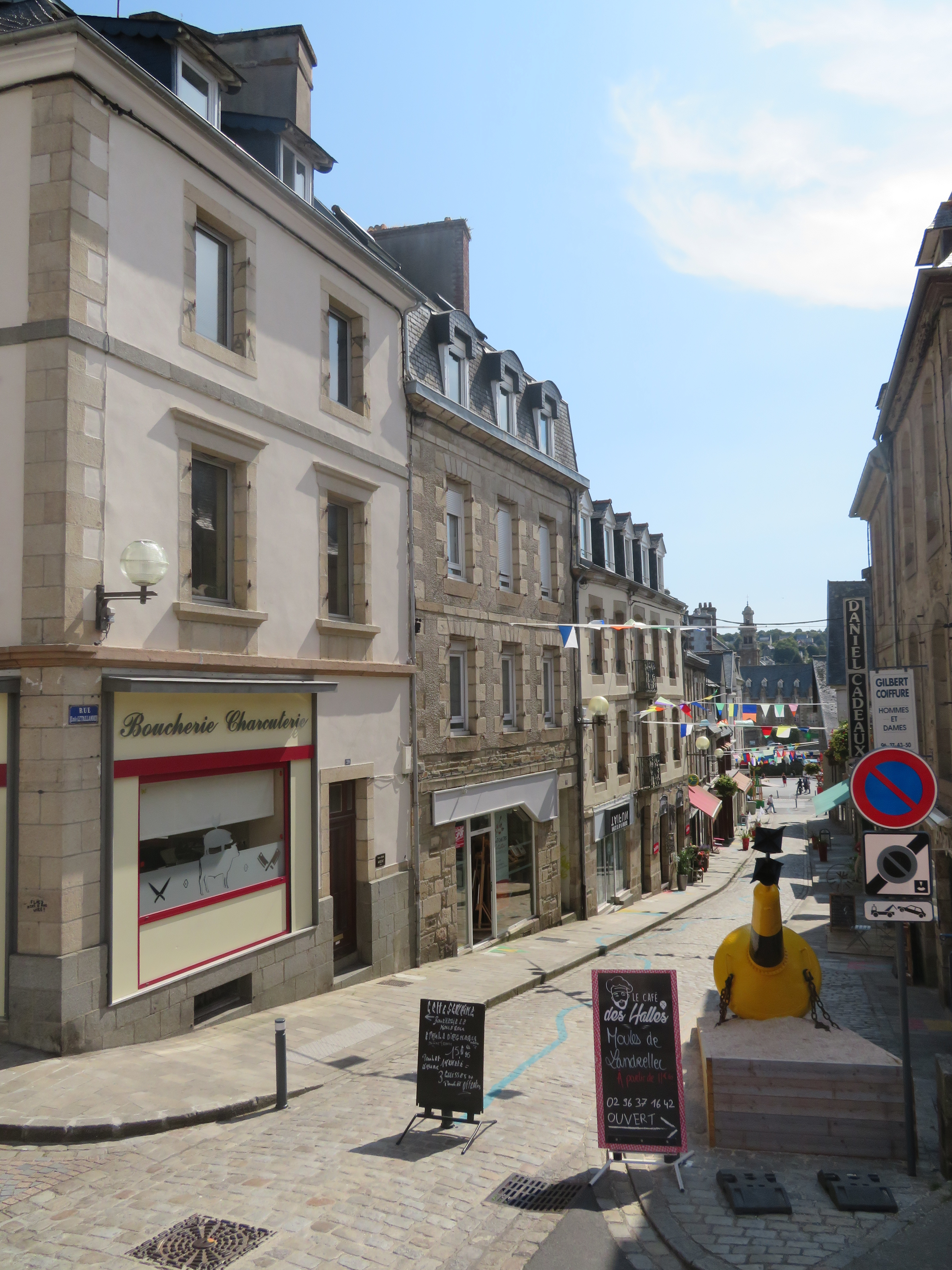 Lannion : front bâti d'immeubles dans la rue Emile Le Taillandier, ancienne rue du port menant de la place du Général Leclerc vers l'ancien port de Lannion.Immatriculation