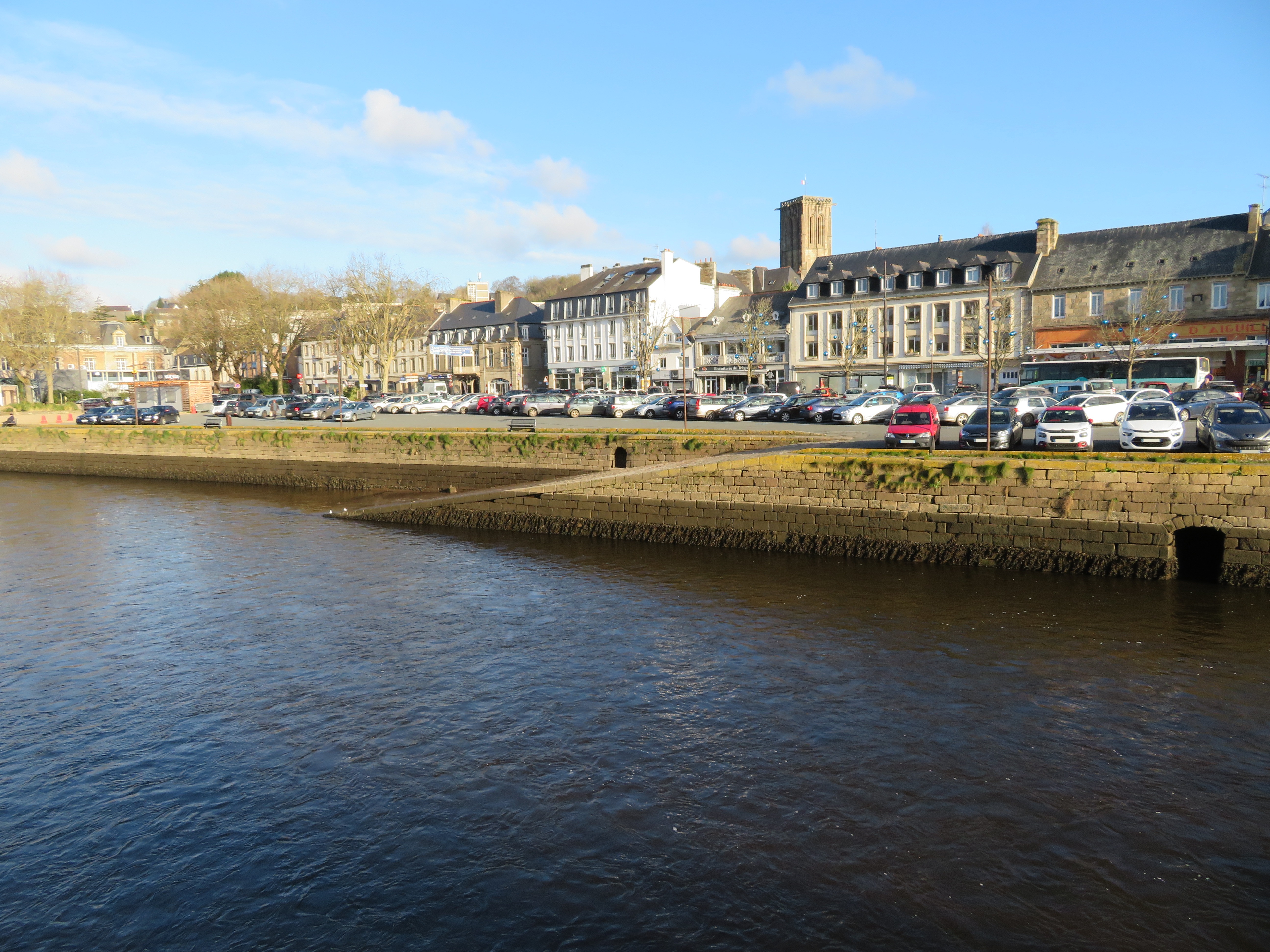Lannion : le quai d'Aiguillon de l'ancien port de Lannion et sa façade d'immeuble, le clocher de l'église Saint-Jean-du-Baly en arrière-plan, vue depuis la rive gauche du LéguerImmatriculation