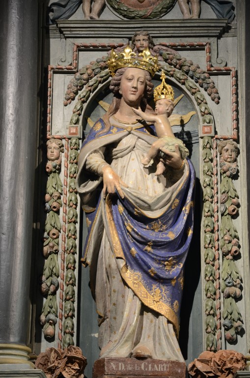Vierge à l'enfant couronnée, dite Notre-Dame de la Clarté avec manteau bleu et doré et robe blanche dans sa nicheImmatriculation