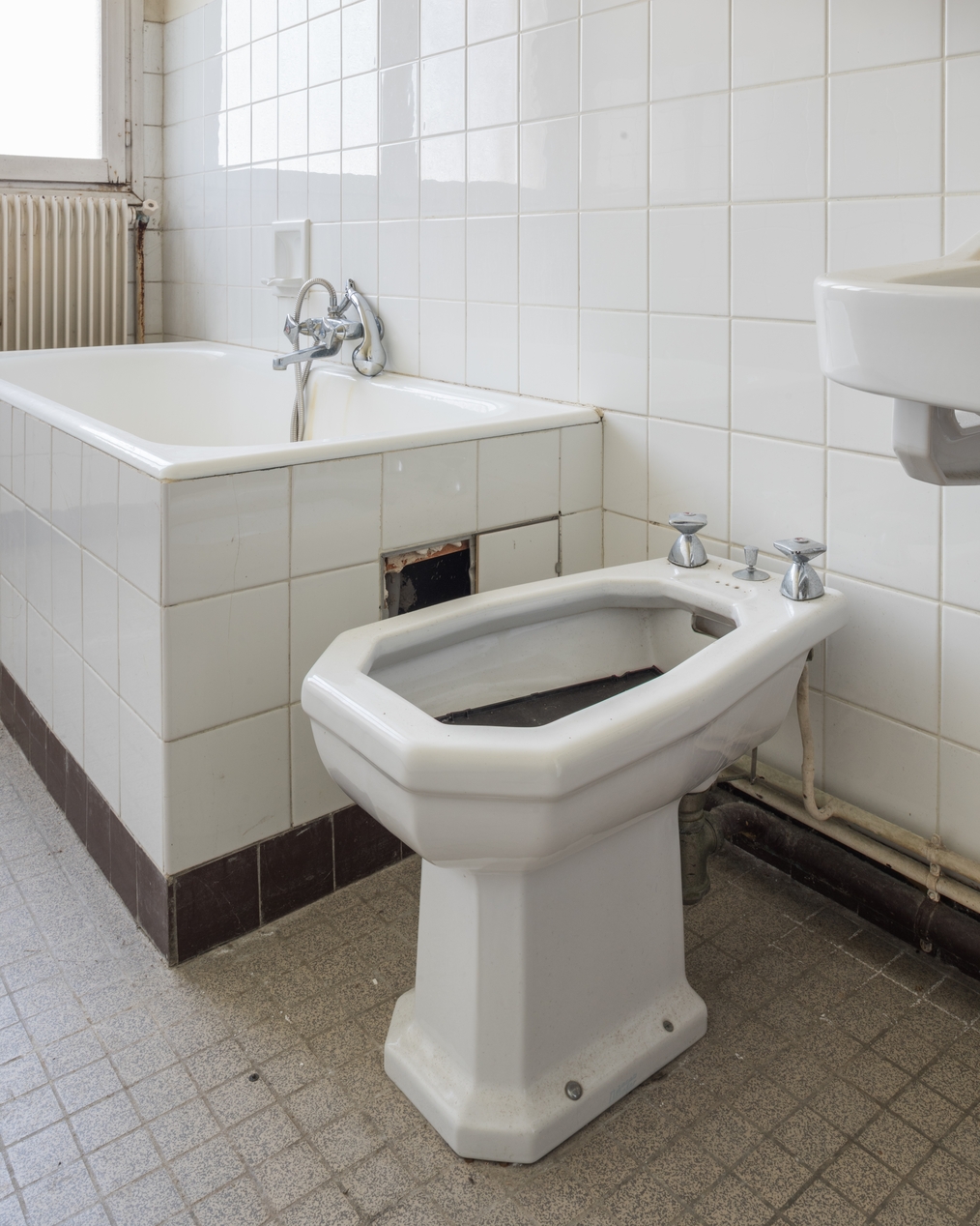 Salle de bain du premier étage, avec baignoire et bidet : détail.Immatriculation