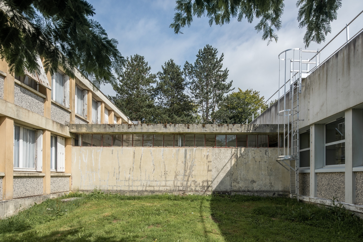 Galerie de liaison entre l'infirmerie et le service de restauration. A gauche, façade est de l'infirmerie. A droite, façade ouest du self.Immatriculation