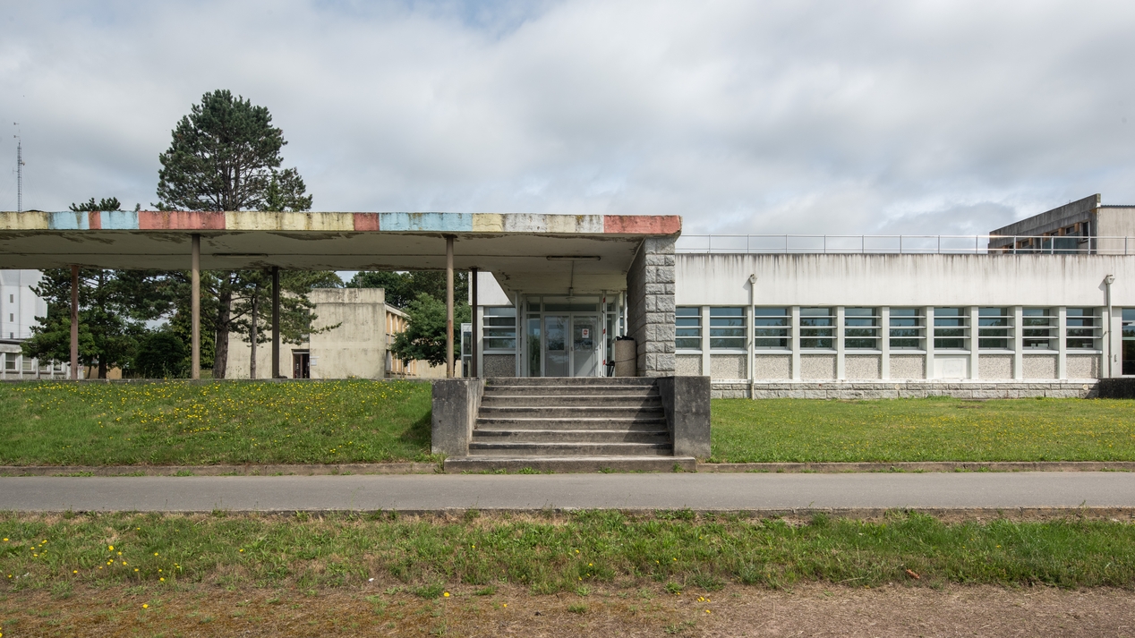 Vue d'ensemble prise du sud. Au premier plan, la galerie couverte et le service de restauration. A l'arrière plan, pignon sud de l'infirmerie détruite en juillet 2020. Péron et Weisbein, architectes, 1967-1968.Immatriculation