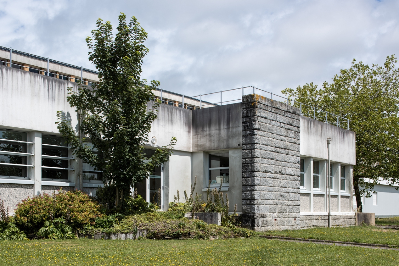 Restauration scolaire, façade sud, vue de la partie est, prise du sud-ouest. Escalier dans-œuvre. Péron et Weisbein, architectes, 1967-1968.Immatriculation