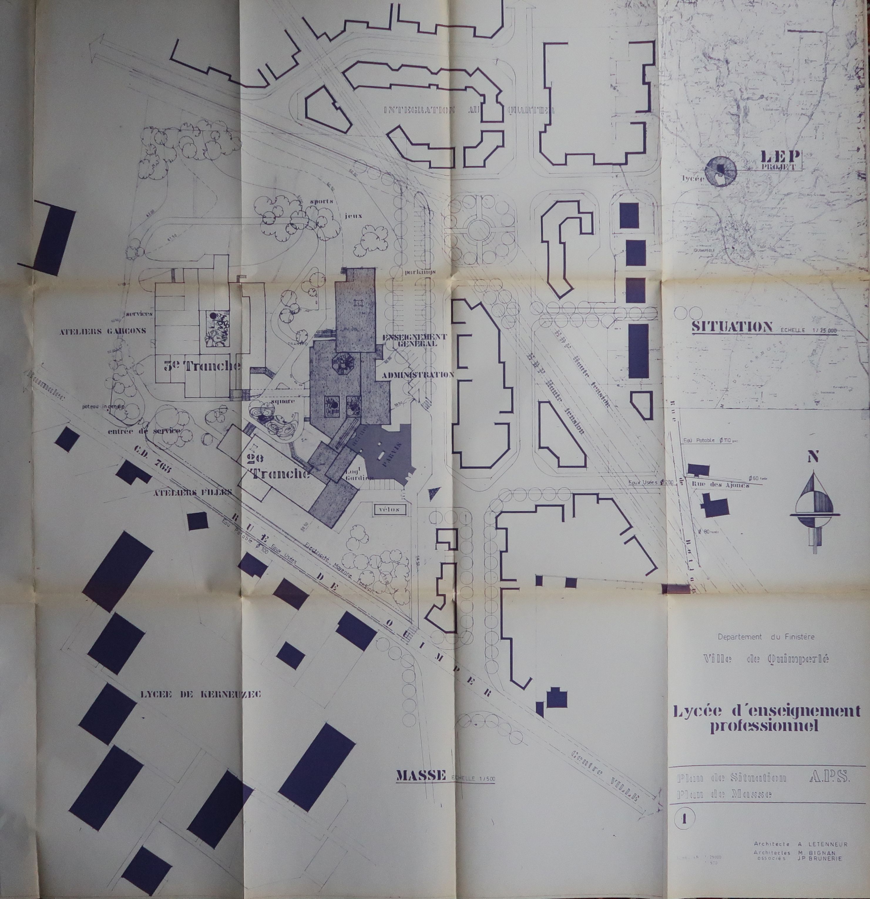 Plan de masse (sd, second semestre 1985). Alain Letenneur, Michel Bignan et Jean-Pierre Brunerie, architectes. Noter la proximité du lycée Kerneuzec, dont le plan de masse, avant restructuration, apparaît au sud-ouest.Immatriculation