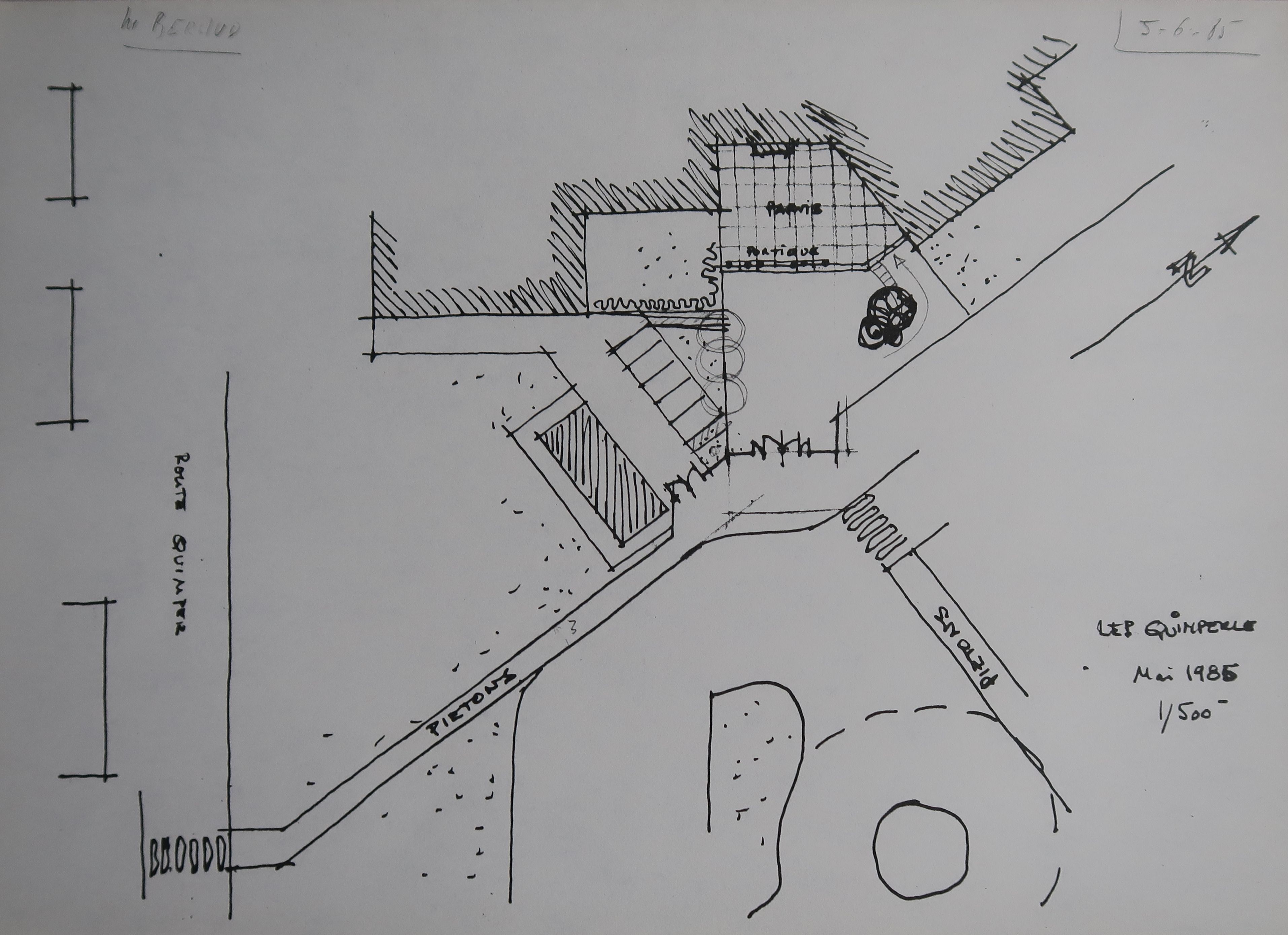 Yslav. Plan de situation du premier projet de décoration (5 juin 1985), refusé par la commission nationale. Noter l'emplacement des trois portiques, alignés au niveau du portail sur ce plan.Immatriculation