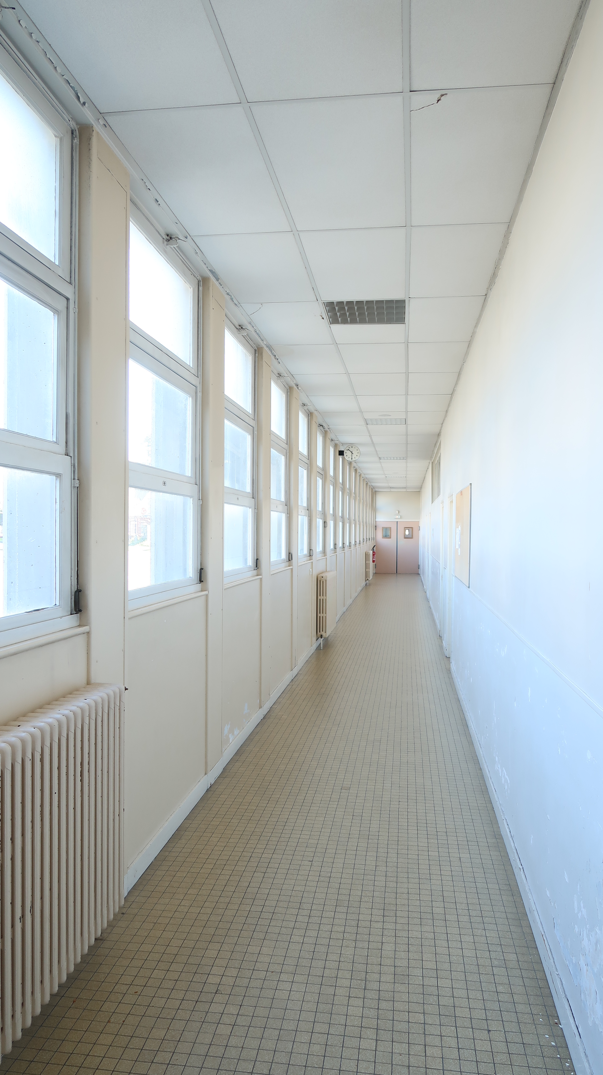 Dégagement latéral, côté nord. Les fenêtres des classes ont été occultées.Immatriculation