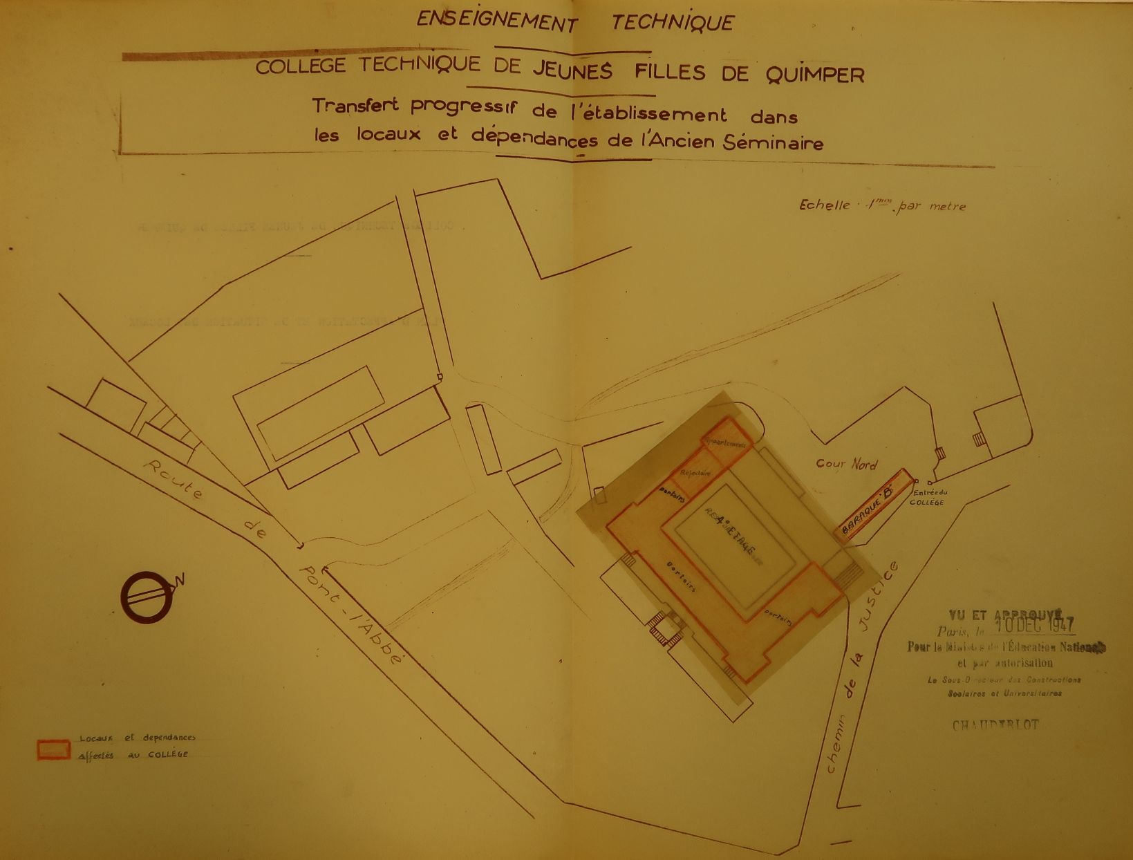 Collège technique de jeunes filles de Quimper. Aménagement du 4e étage de l'ancien séminaire. Plan de masse. 10 décembre 1947.Immatriculation