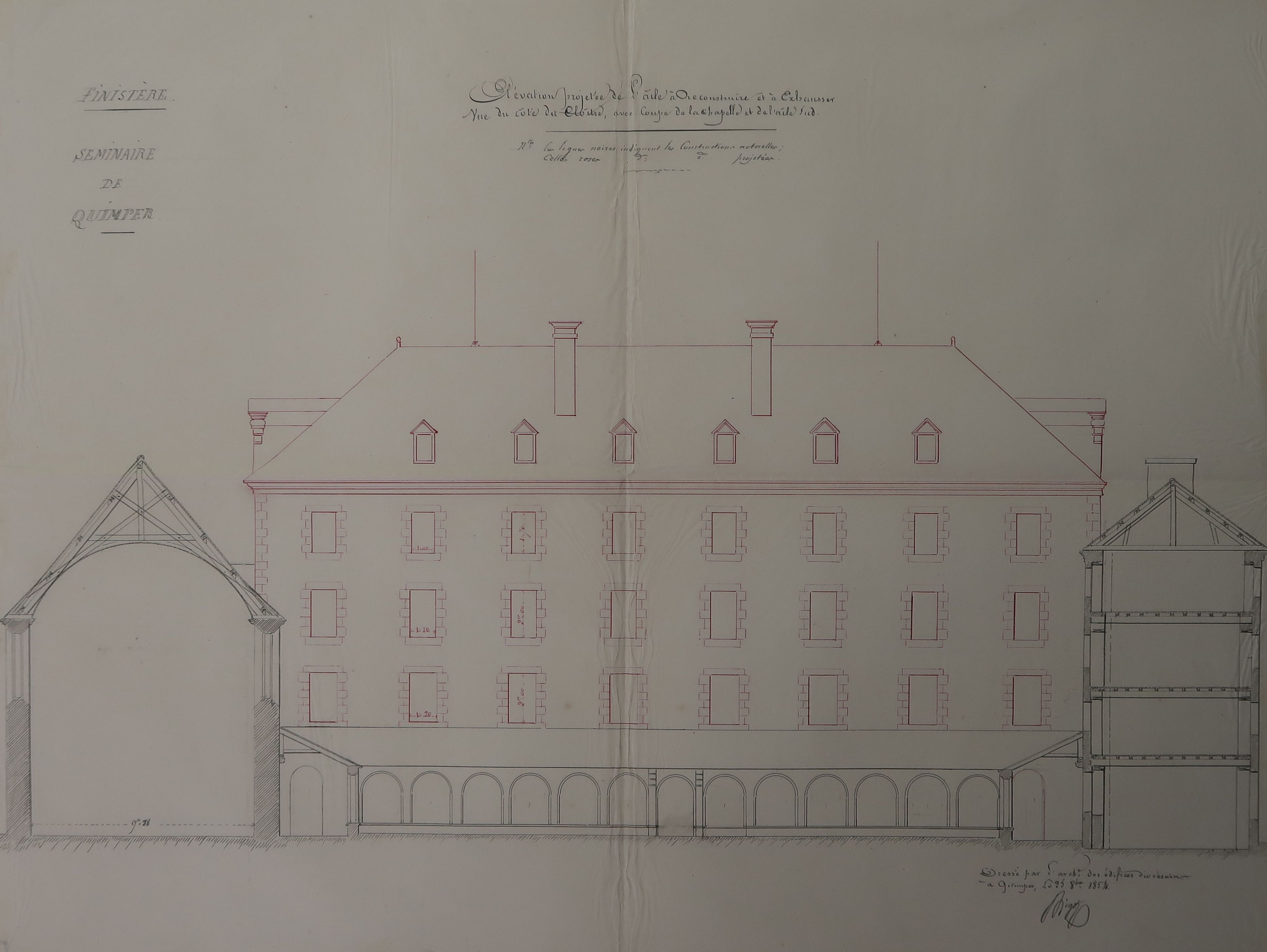 Élévation côté cour de l'aile à reconstruire et à exhausser (aile nord-est, la coupe de la chapelle, à gauche peut servir de repère). Joseph Bigot architecte, 25 octobre 1854. Le cloitre de ce côté là, est conservé et demeurera par la suite.Immatriculation