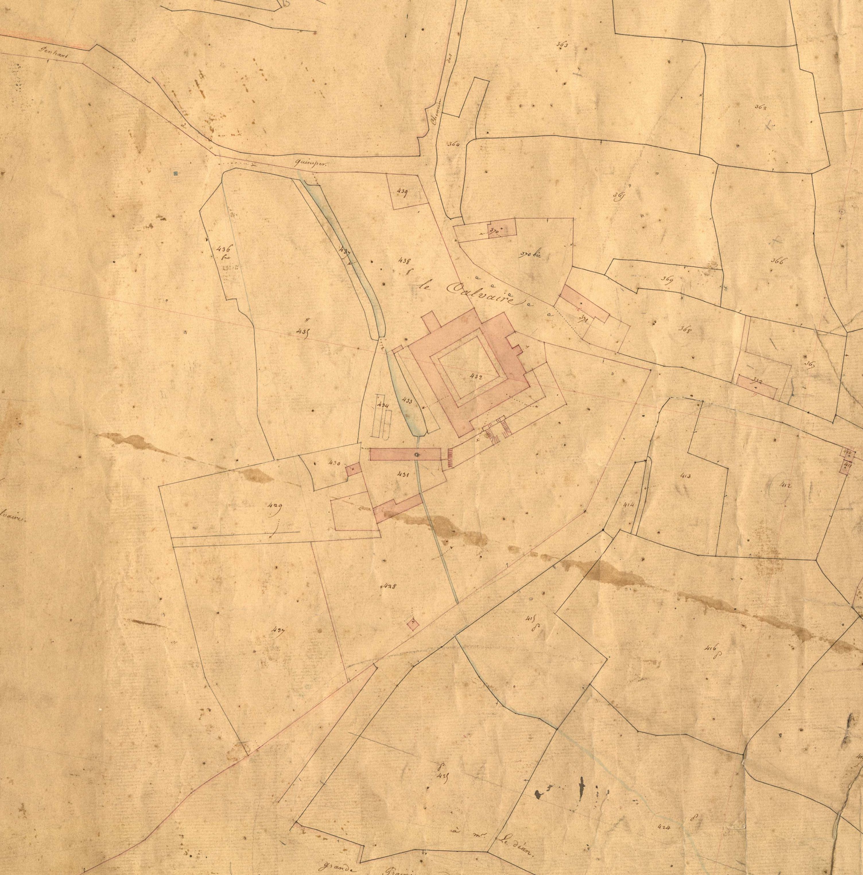 Cadastre napoléonien : détail. Planche établit vers 1834-1836. Noter la présence de l'escalier monumental au sud-est du bâtiment principal et d'un moulin, au sud des deux étangs.Immatriculation