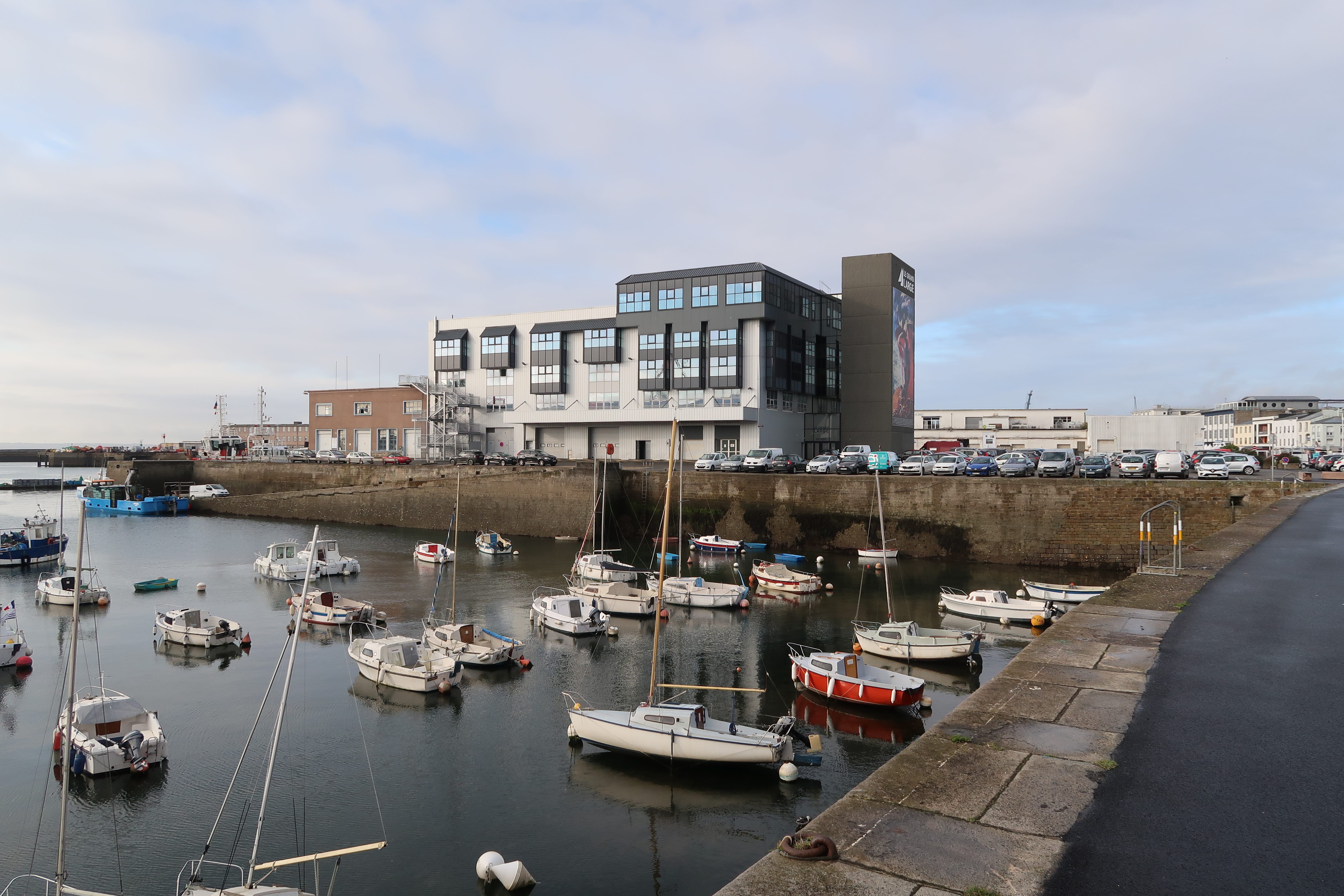 2e éperon, vu depuis le 3e bassin : quai Est, immeuble Grand Large (1986) et ancien magasin BImmatriculation