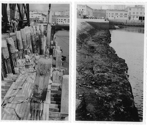 Photographies de suivi de chantier : perré provisoire (1945) et arase du quai de 1860 ; pieux en béton et ferraillage (1956)Immatriculation