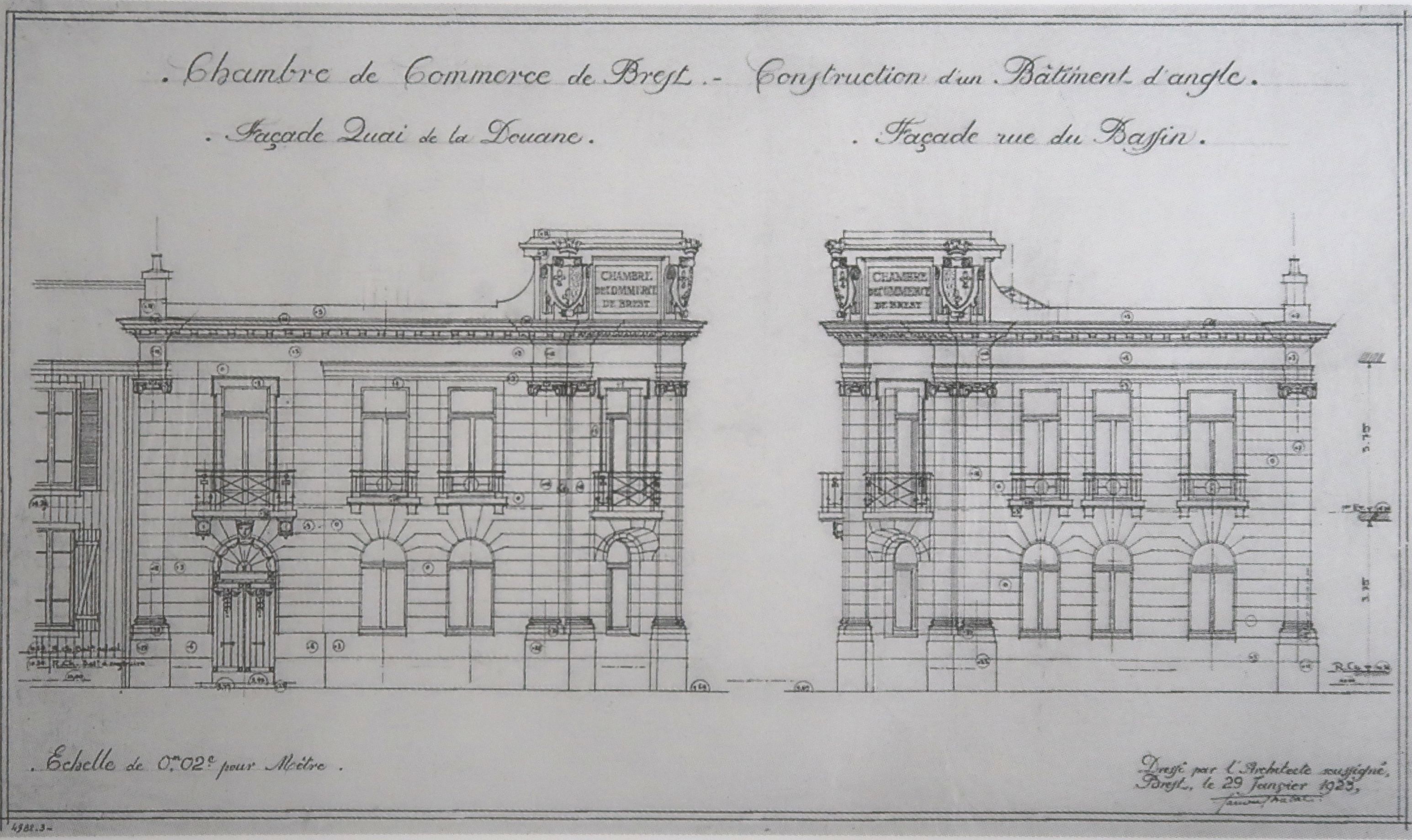 Gaston Chabal, Chambre de commerce de Brest, projet de construction d'un bâtiment d'angle, 29 janvier 1923 (Archives municipales et communautaires de Brest, 7 S 389 ; extrait de l'ouvrage Décors peints en Bretagne)Immatriculation