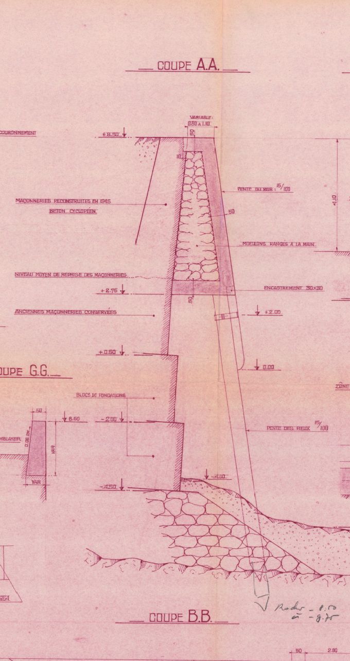 Plan : reconstruction définitive du mur au droit du poste d'accostage de la vedette de pilotage, coffrage : coupe AA (extrait)Immatriculation