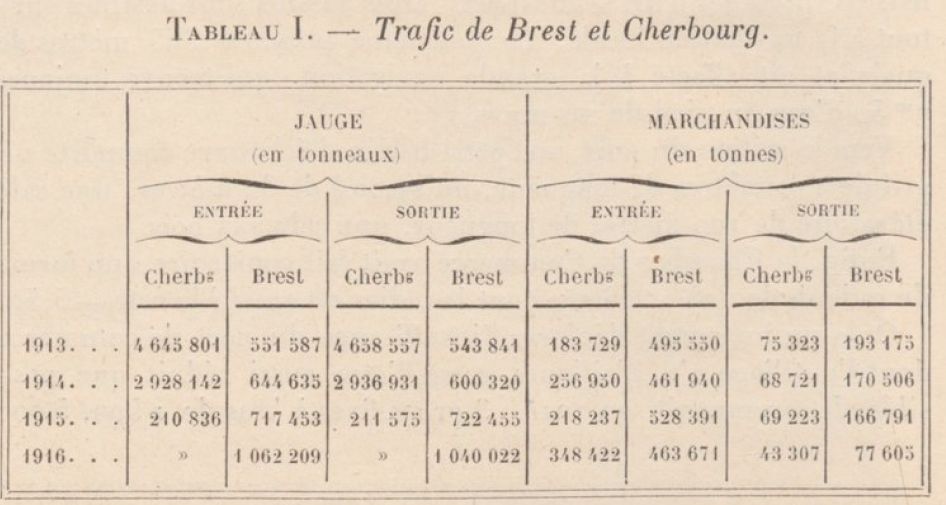 Trafic (jauge et marchandises) des ports de Brest et Cherbourg de 1913 à 1916Immatriculation