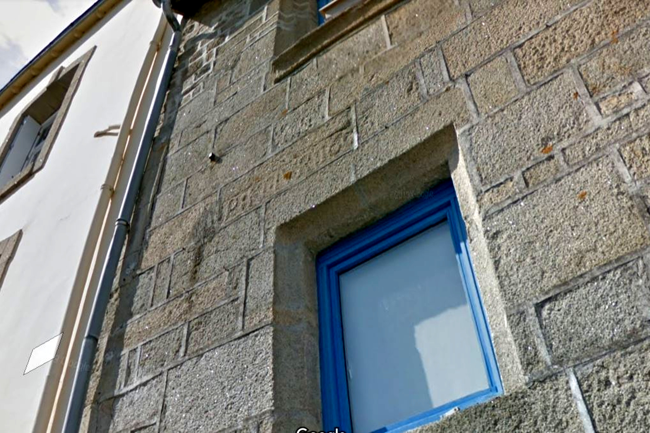 Elévation antérieure, détail d'une pierre de la façade et inscription : "P : (?)MVR 1673"Immatriculation