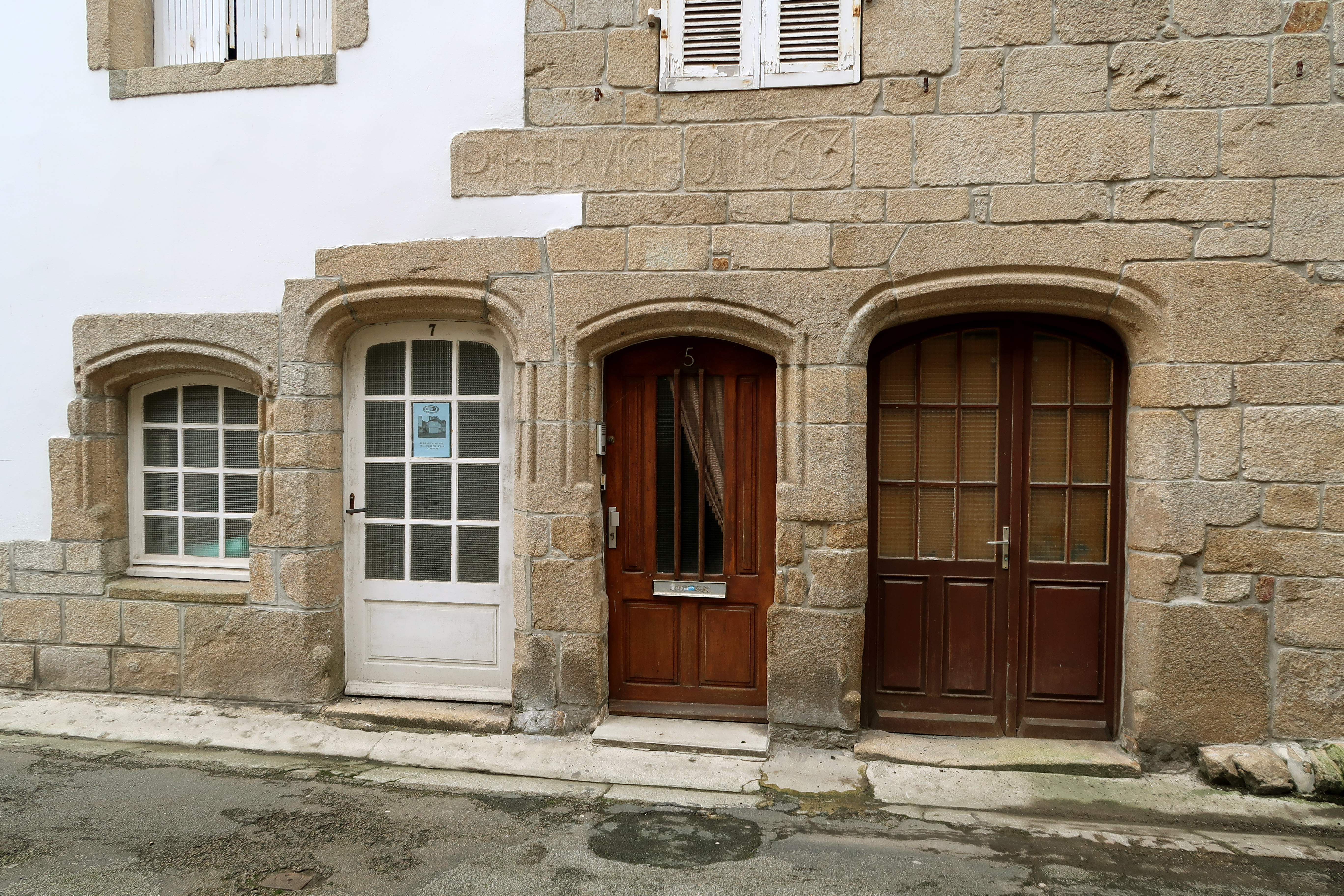 Rue Louis Pasteur côté ouest, maisons aux n°5 et 7. Détail des portes et fenêtres en anse de panier moulurées et inscription "P : HERVICHON : 1603". (2020)Immatriculation