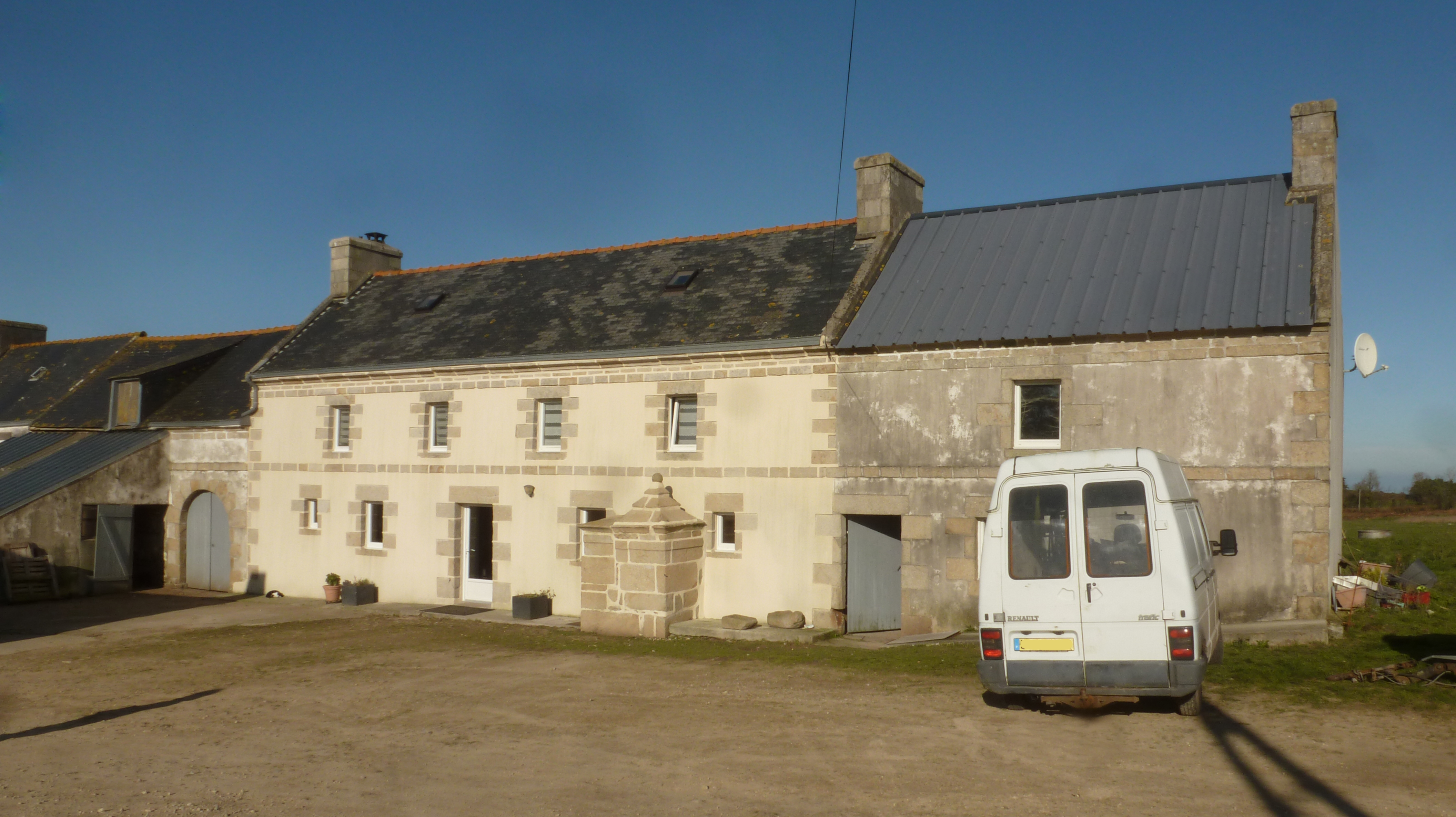 Mesgall, ferme 1, élévation antérieure de l'alignement principal : logis, grange, écurie et puits accolé à la facade sud du logis. (2020)Immatriculation