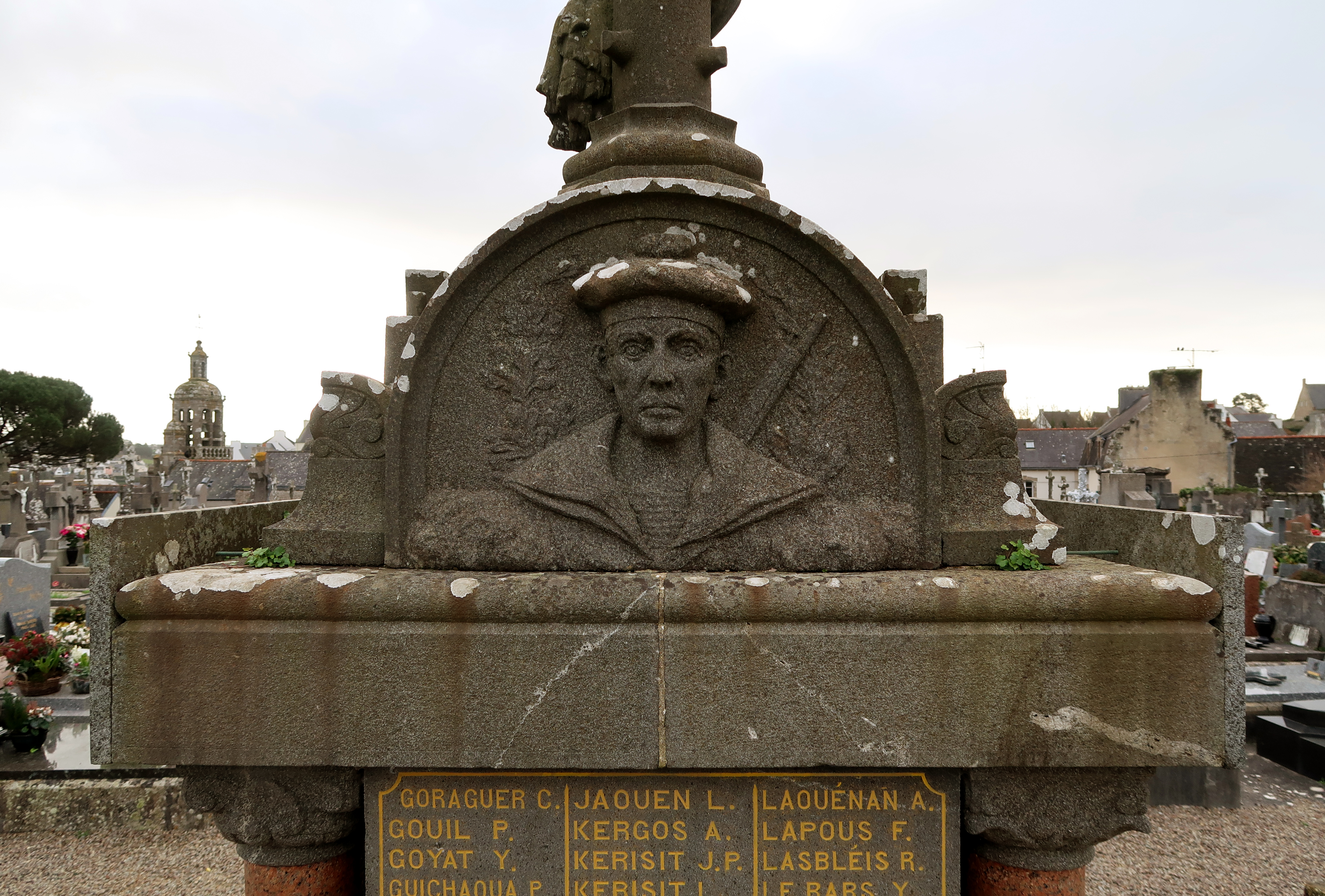 Croix du cimetière et monument aux morts, vue rapprochée du côté nord : représentation d'un marin. (2020)Immatriculation