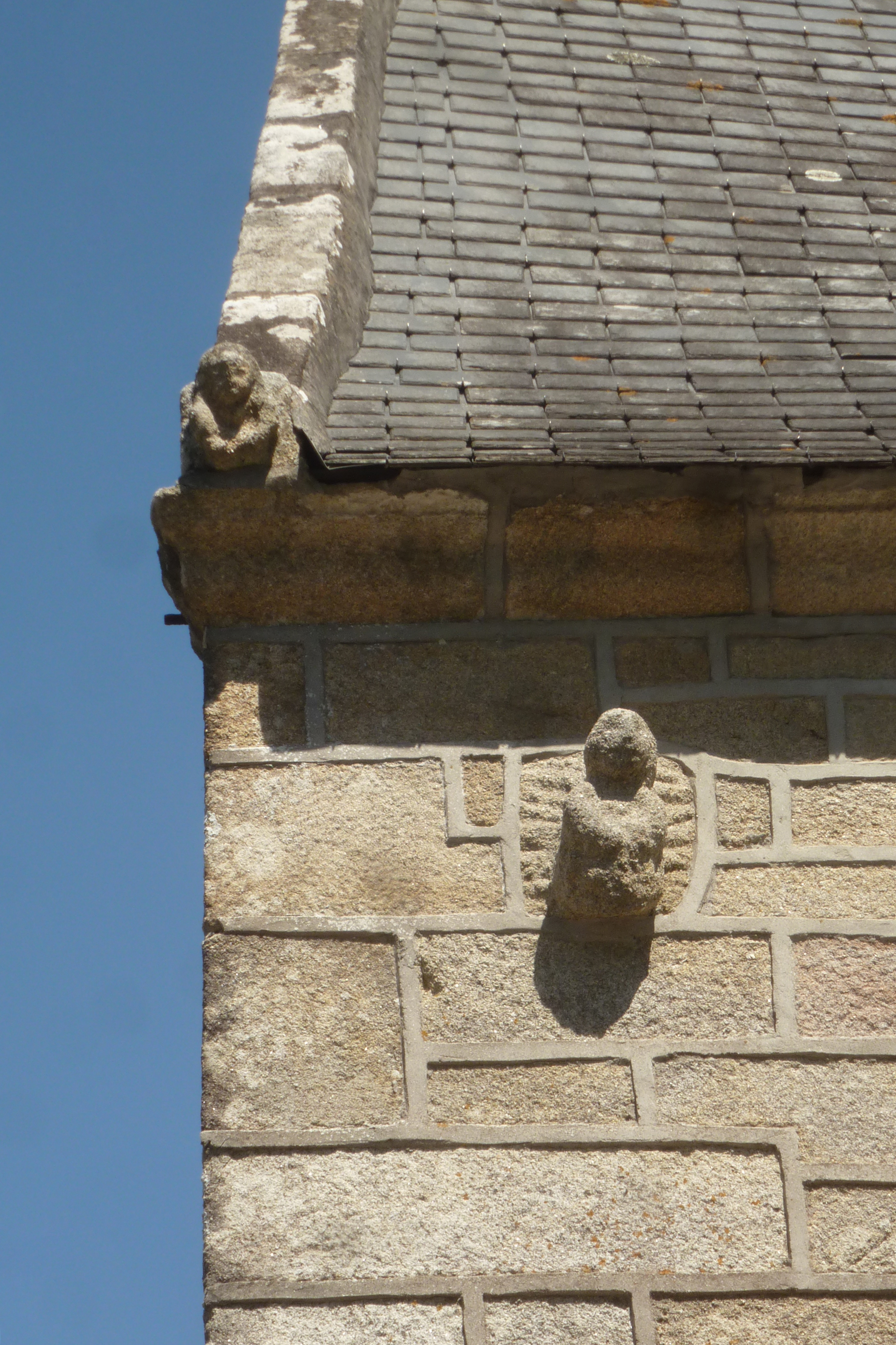 Elévation antérieure, niveau toit, angle nord-ouest. Décors sculptés. (2020)Immatriculation