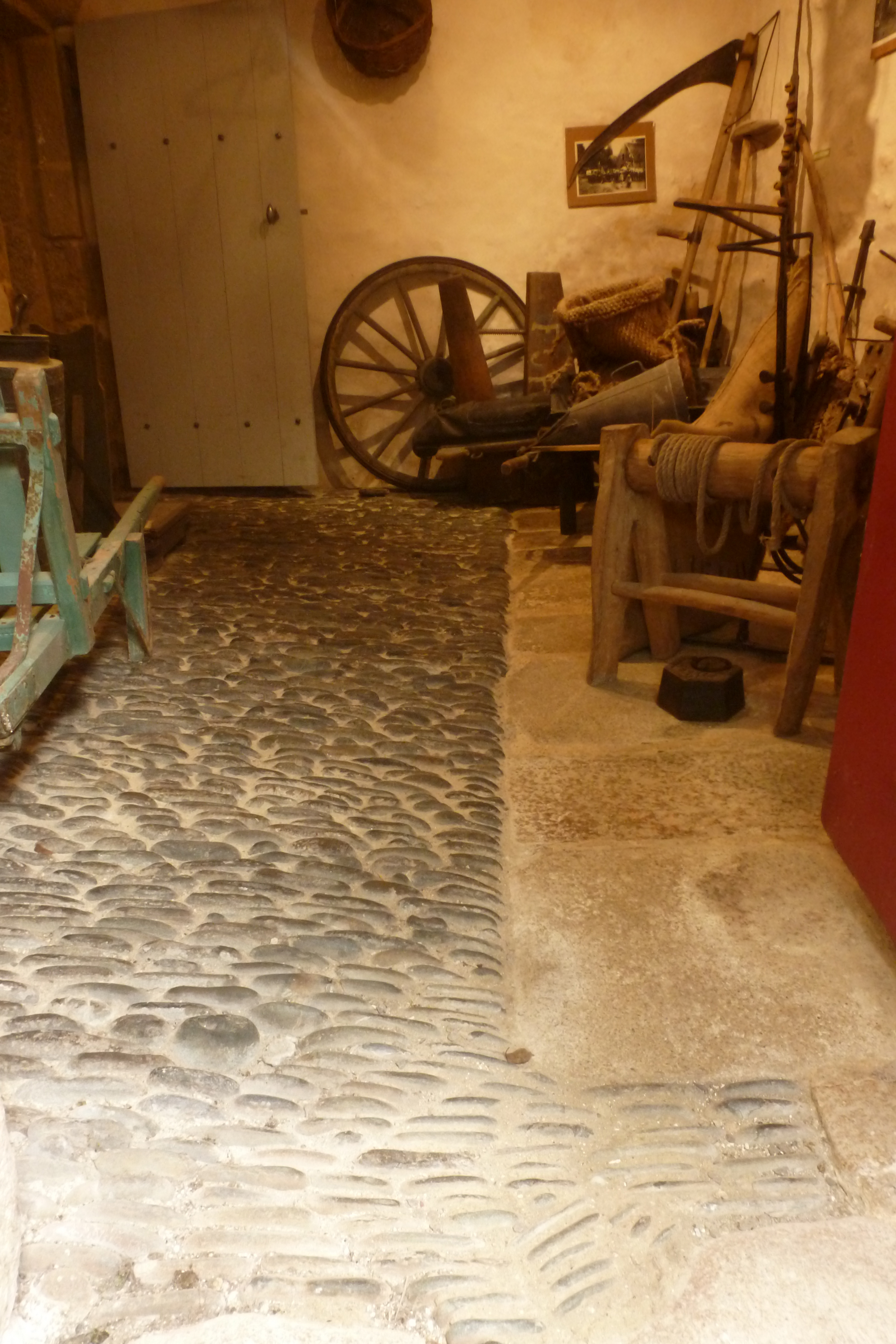 Rez-de-chaussée, pièce nord-ouest (écurie), vue prise du nord. Détail du sol dallé en galets de mer sur champ. (2020)Immatriculation
