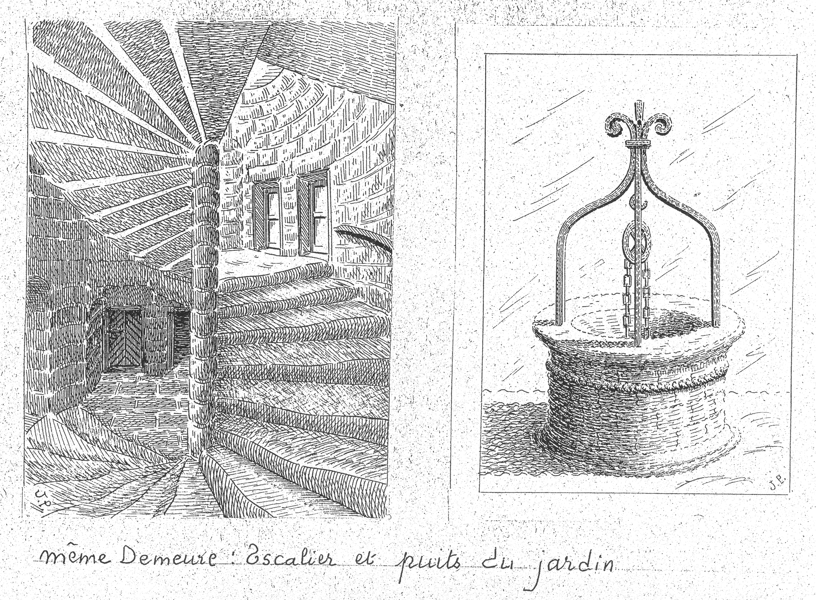 Escalier à vis et puits. Reproduction d'un dessin de Jeanne Pennamen, milieu du 20e siècle.Immatriculation