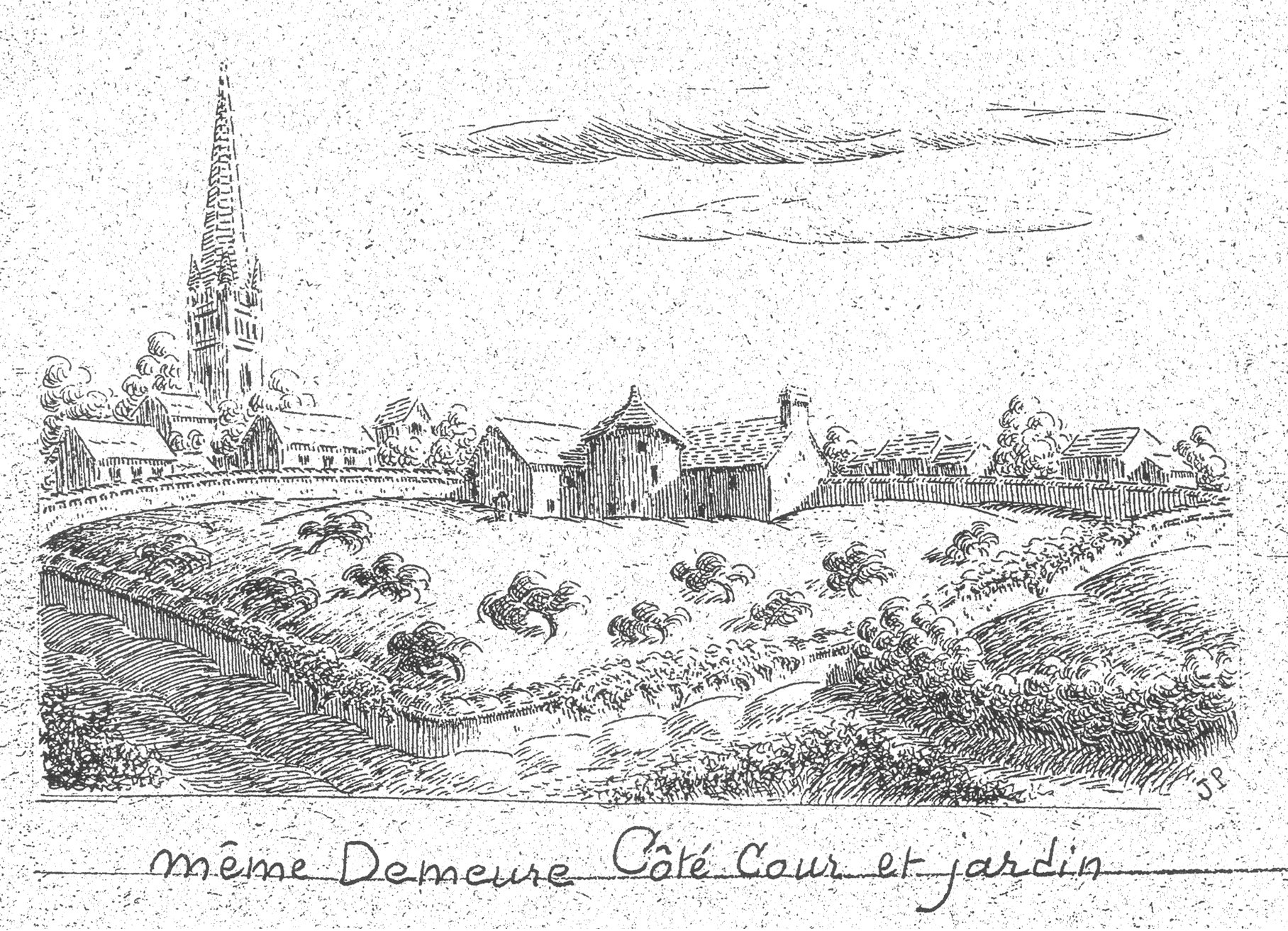 Vue d'ensemble nord-ouest. Reproduction d'un dessin de Jeanne Pennamen, milieu du 20e siècle.Immatriculation