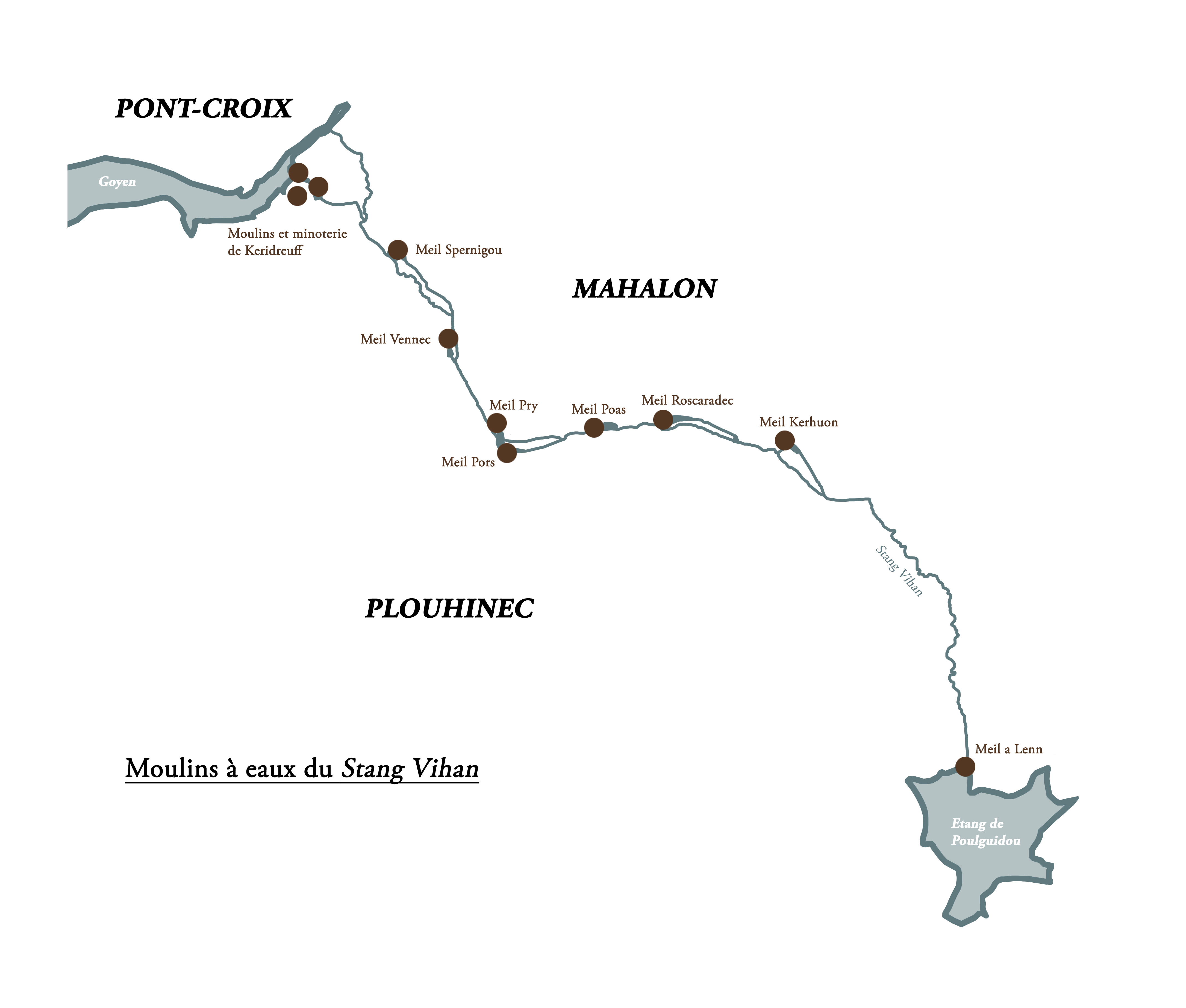 Les moulins à eau du Stang Vihan. Carte de localisation.Immatriculation