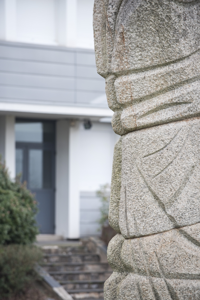 Sculpture d'Helier Pellerin et Lise Mazo pour le lycée professionnel Jean Guéhenno : détail.Immatriculation