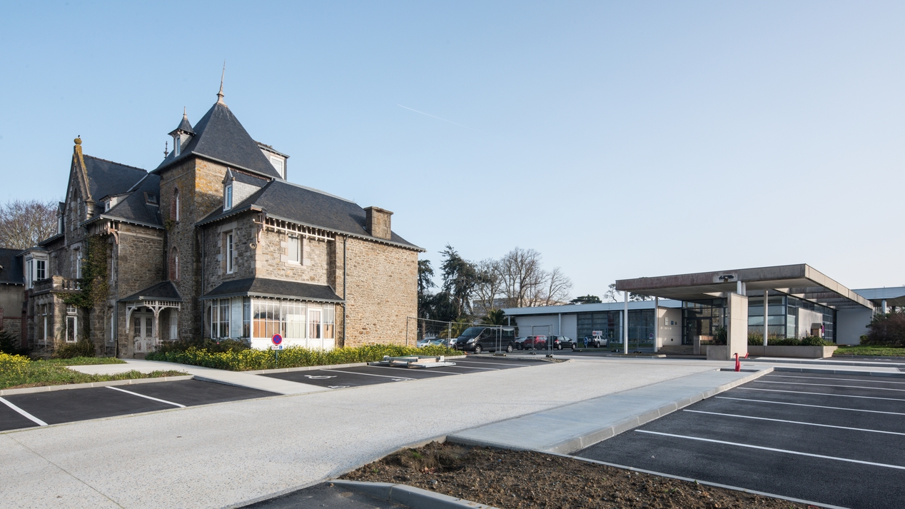 Façade ouest et sud. Restaurant pédagogique et salle des fêtes, façade ouest, entrée du public (Pierre Pacault, architecte, 1993).Immatriculation