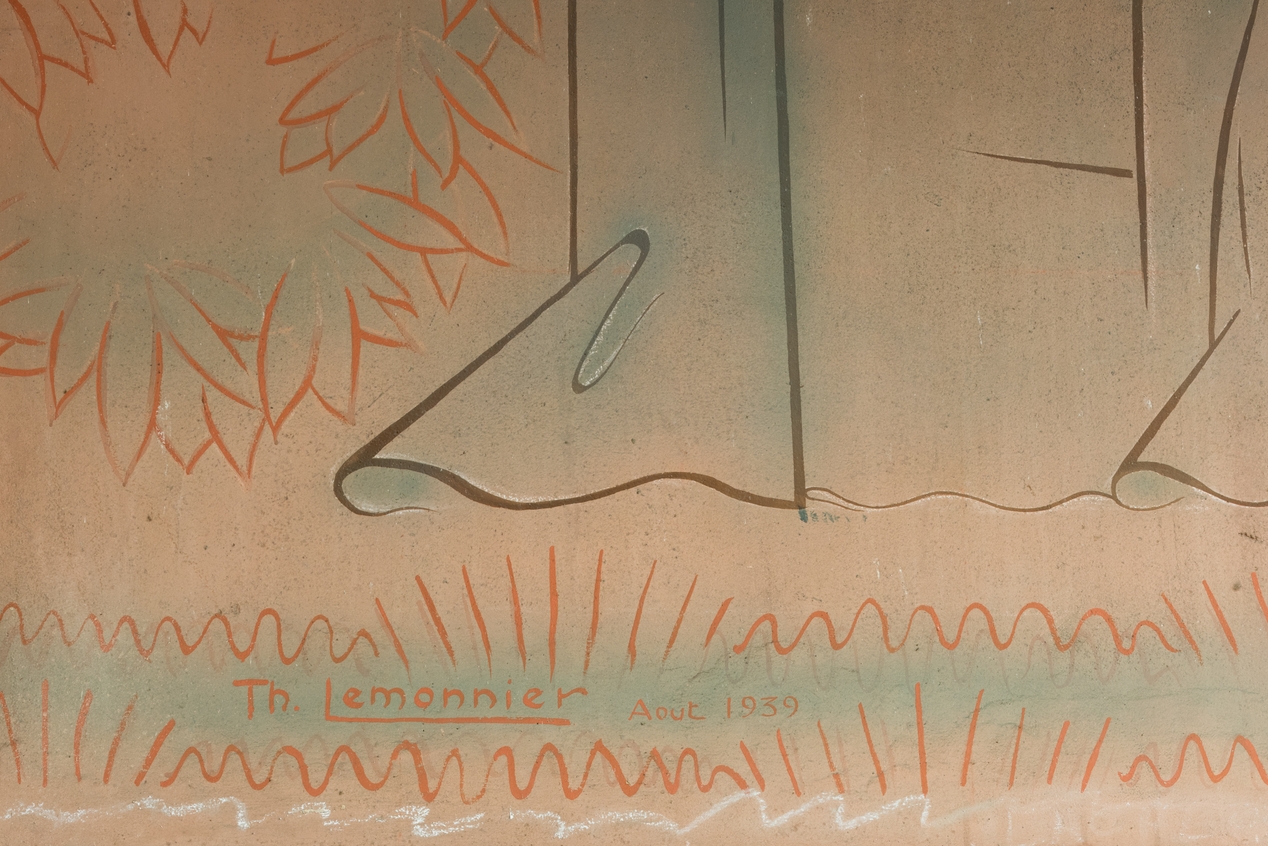 Fresque de Théophile Lemonnier, 1939 : détail sur la signature et la date.Immatriculation