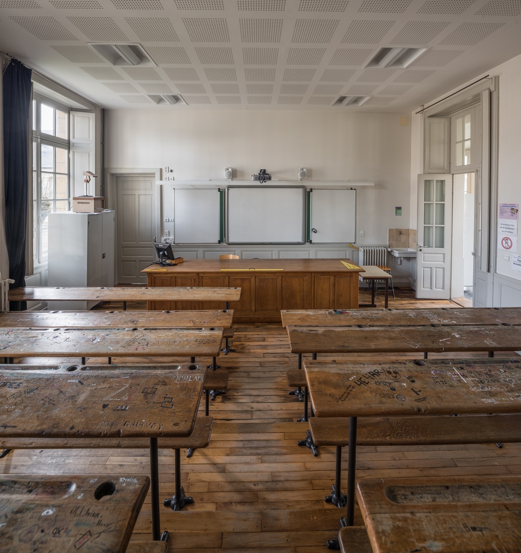 Petit amphithéâtre de physique, vue depuis le haut des estrades.Immatriculation