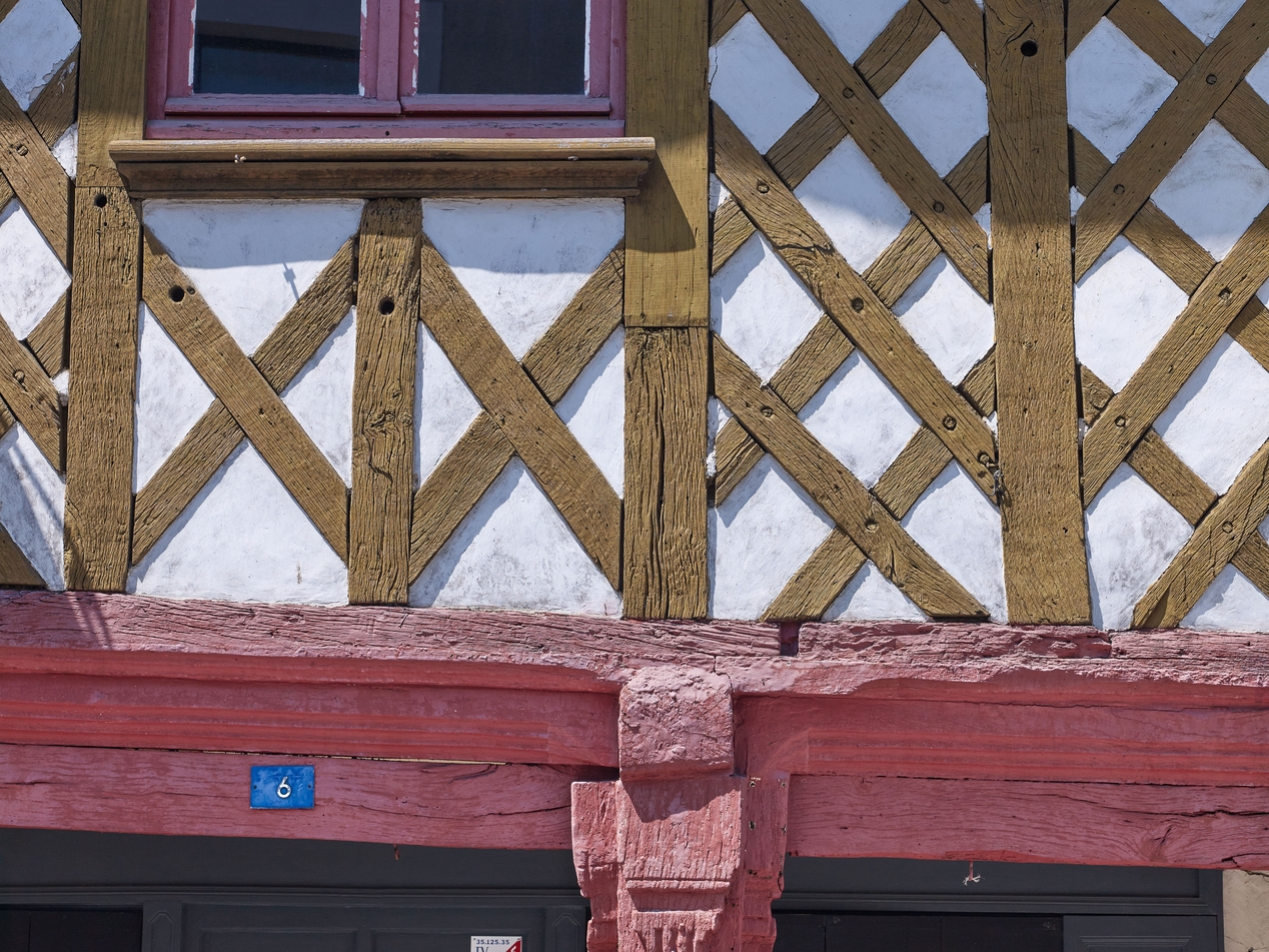 Contreventement en croisillons avec chevillage des éléments. Une marque de charpentier portant le chiffre II est visible sous la fenêtre sur la croix de Saint-André droite (en haut à droite)Immatriculation