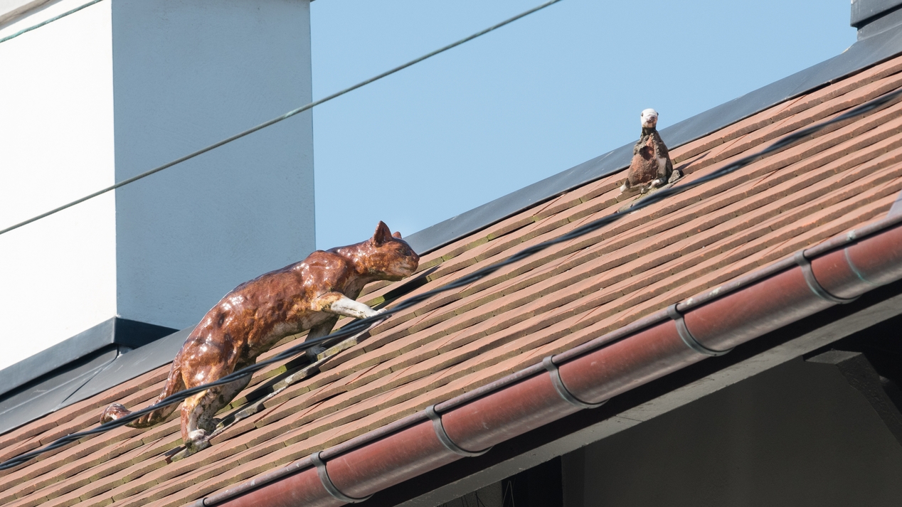 Céramique ornant le toit : le chat et l'oiseauImmatriculation