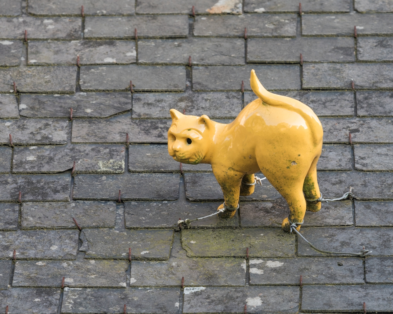 Détail ornement du toit : chat en céramiqueImmatriculation