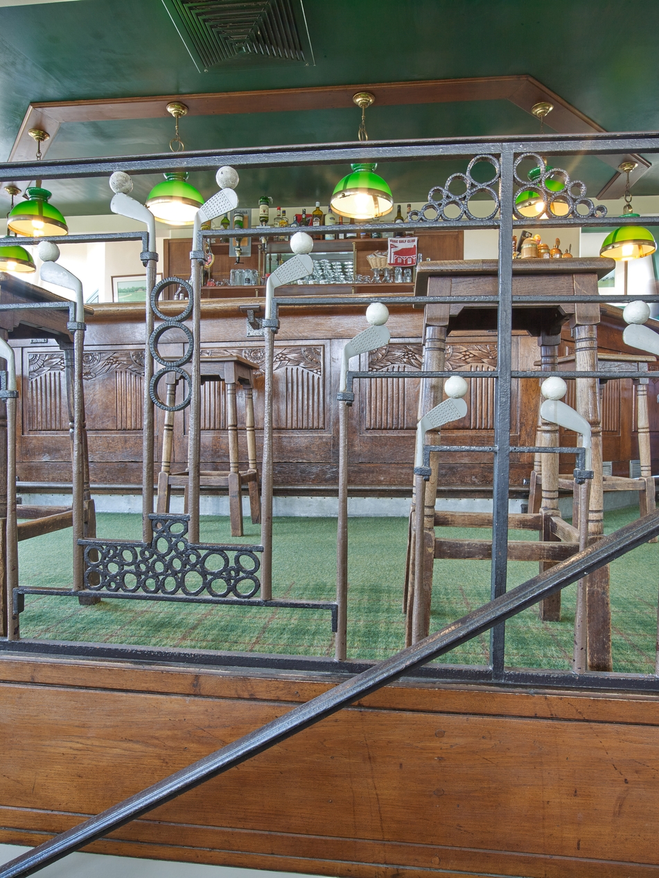 Vue intérieure du 'club house', détail du garde-corps en ferronnerie, avec clubs et balles de golfImmatriculation