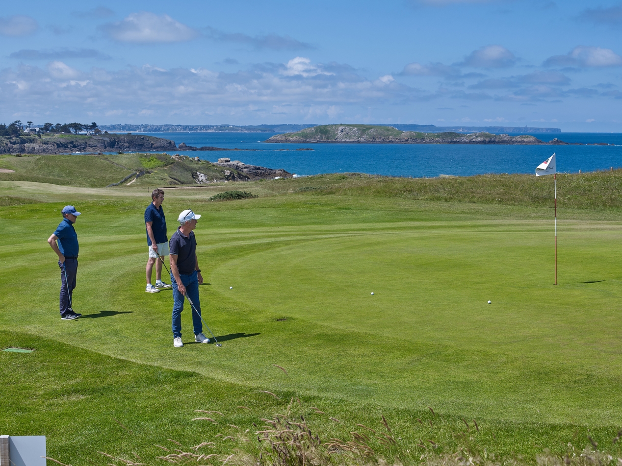 Joueurs sur un 'green' et paysage côtier jusqu'au cap FréhelImmatriculation