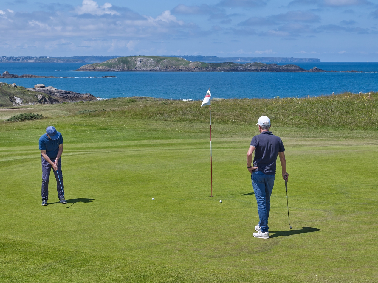 Joueurs sur un 'green' et paysage côtier jusqu'au cap FréhelImmatriculation