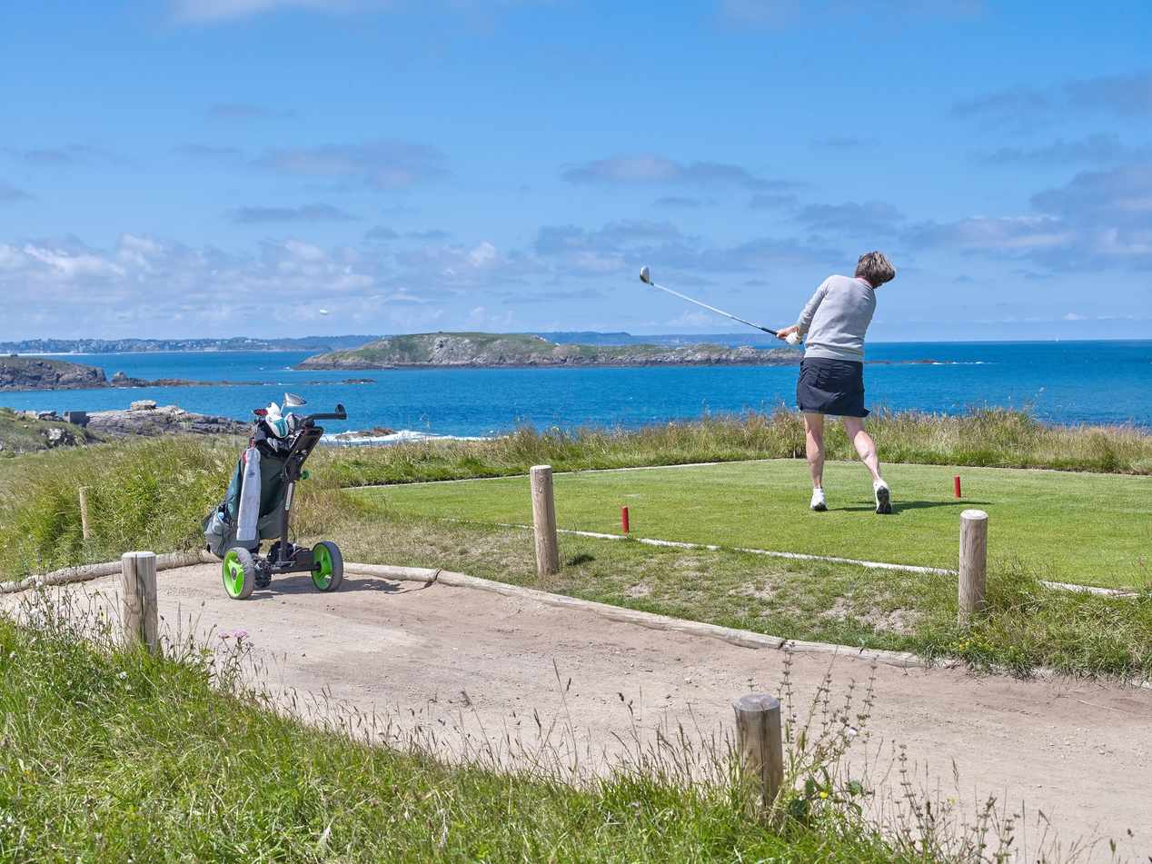 Vue d'un 'green' avec une golfeuse et paysage de Saint-Briac avec l'ile d'AgotImmatriculation