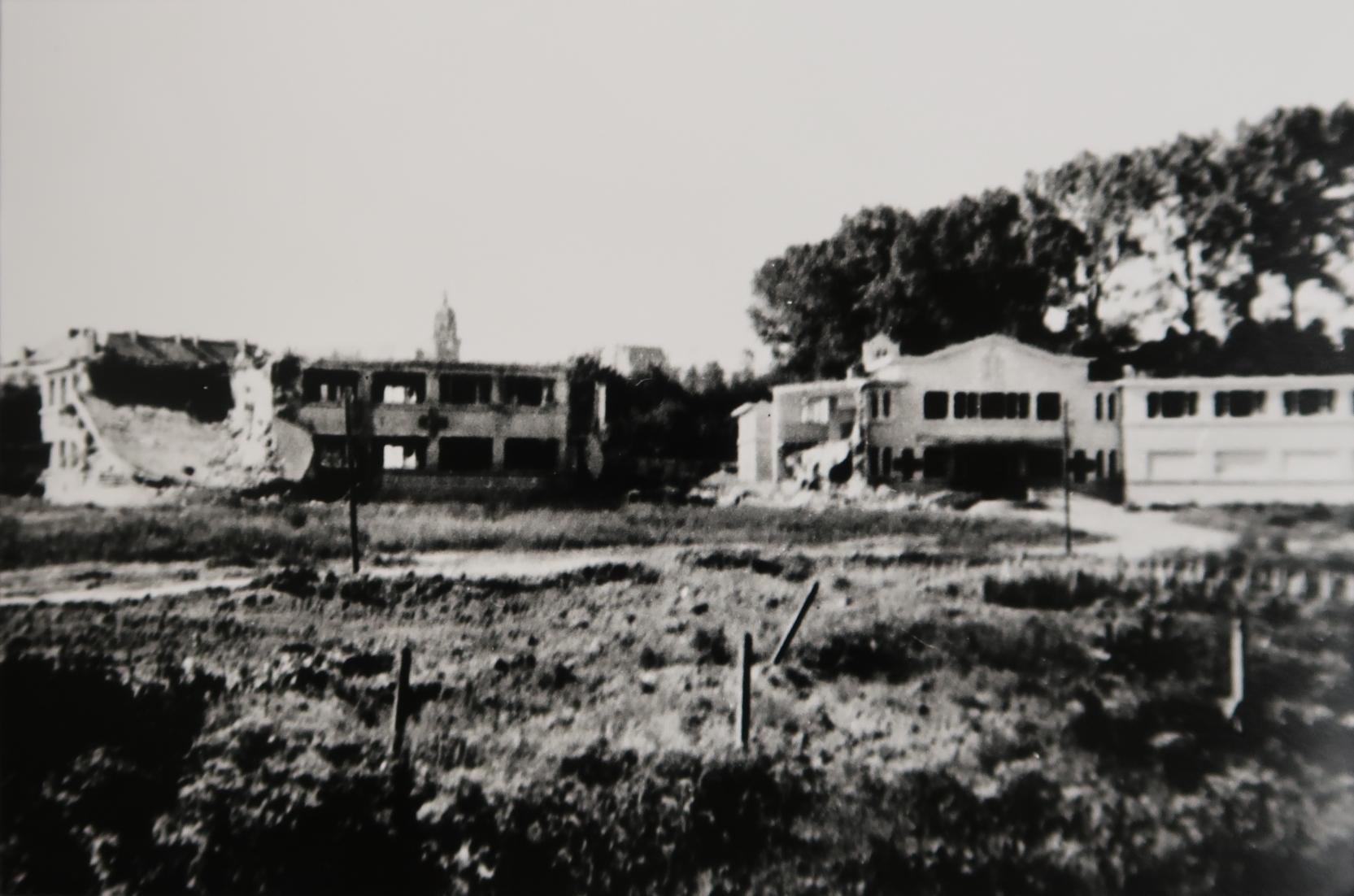 L'hospice de vieillards de la Chesnardière après les bombarements de juin 1944. On note la présence, au fronton de l'entrée, du haut-relief en plâtre. Il représentait la Ville de Fougères, accueillant les vieillards.Immatriculation