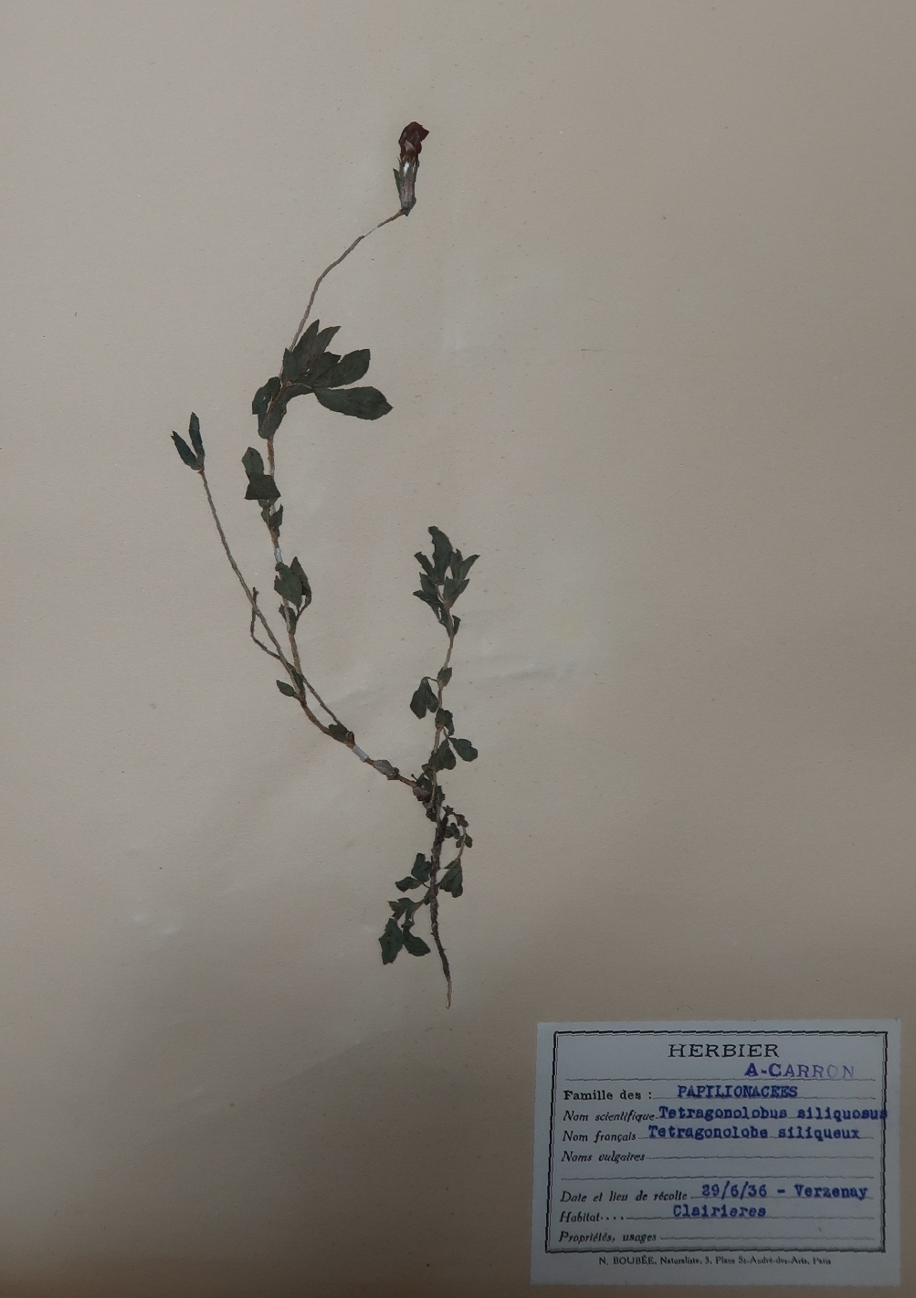Collections pédagogiques. Page d'un herbier "A. CArron" fourni par les établissements Boubée : Tetragonolobe siliqueux, récolté à Verzenay (51), en 1936.Immatriculation