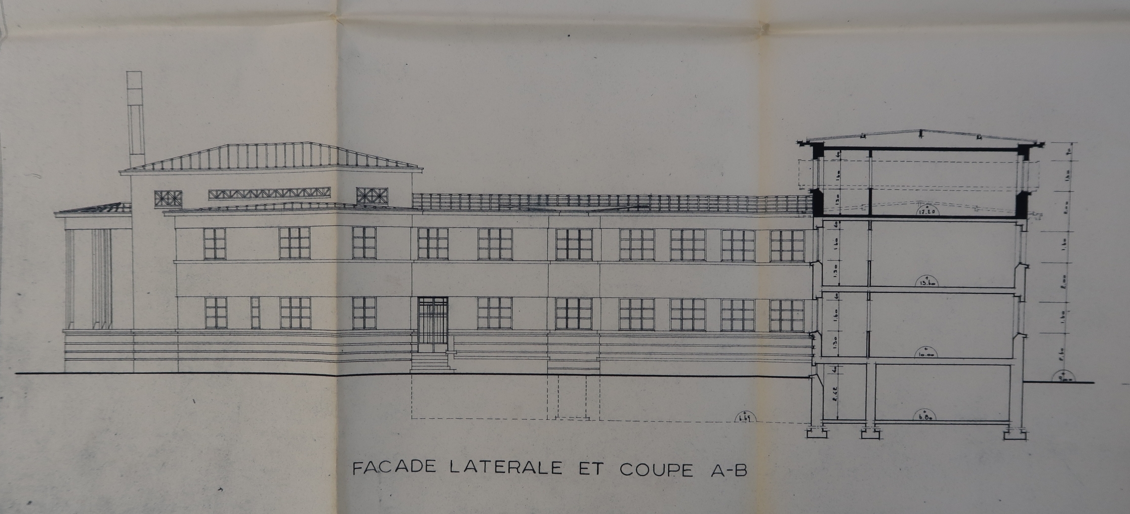 Archives municipales de Fougères : 2 MN 5/5.1. Albert Hec, Plans et élévations de l'hospice de vieillards de Fougères et du lycée classique et moderne mixte, 1964.