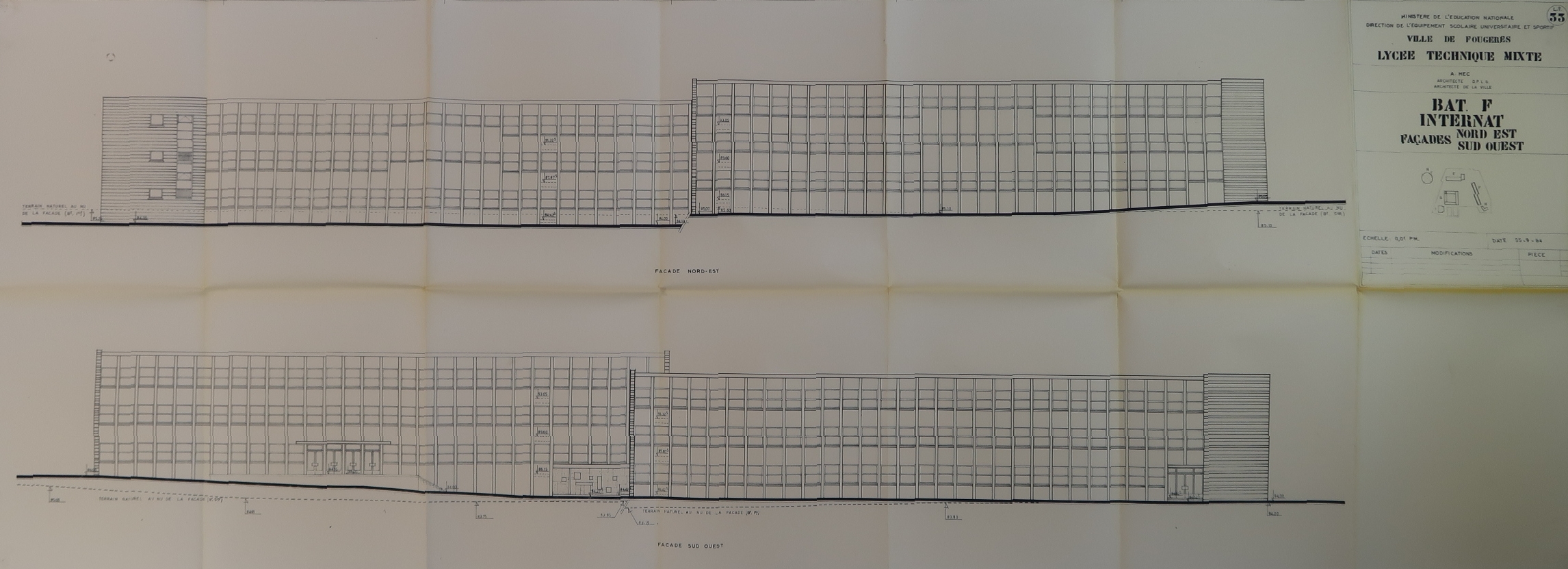 Archives municipales de Fougères : 2 NM 5 - 5/1. Hec [Albert], Plans et élévations du lycée technique mixte de Fougères, 1964