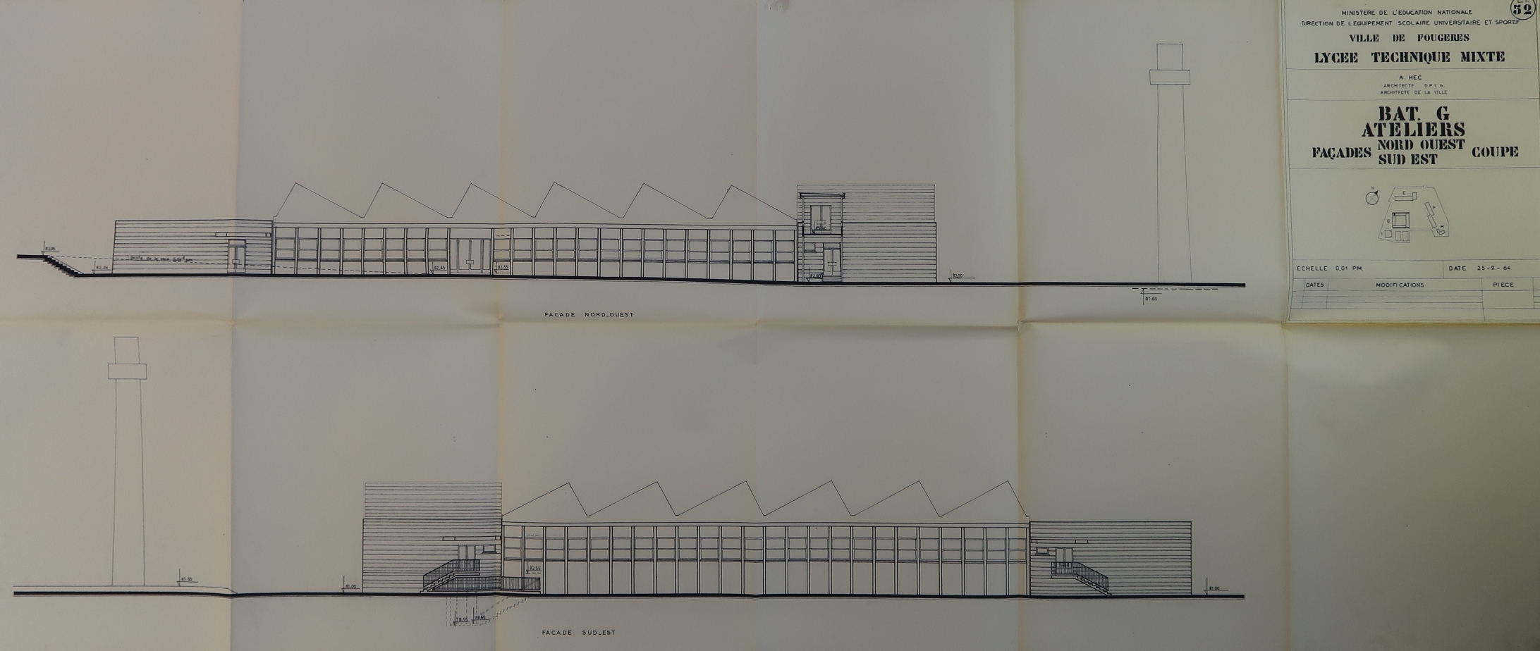 Bâtiment G, Ateliers. Façades nord-ouest - sud-est et Coupe. Albert Hec, architecte. 1964.