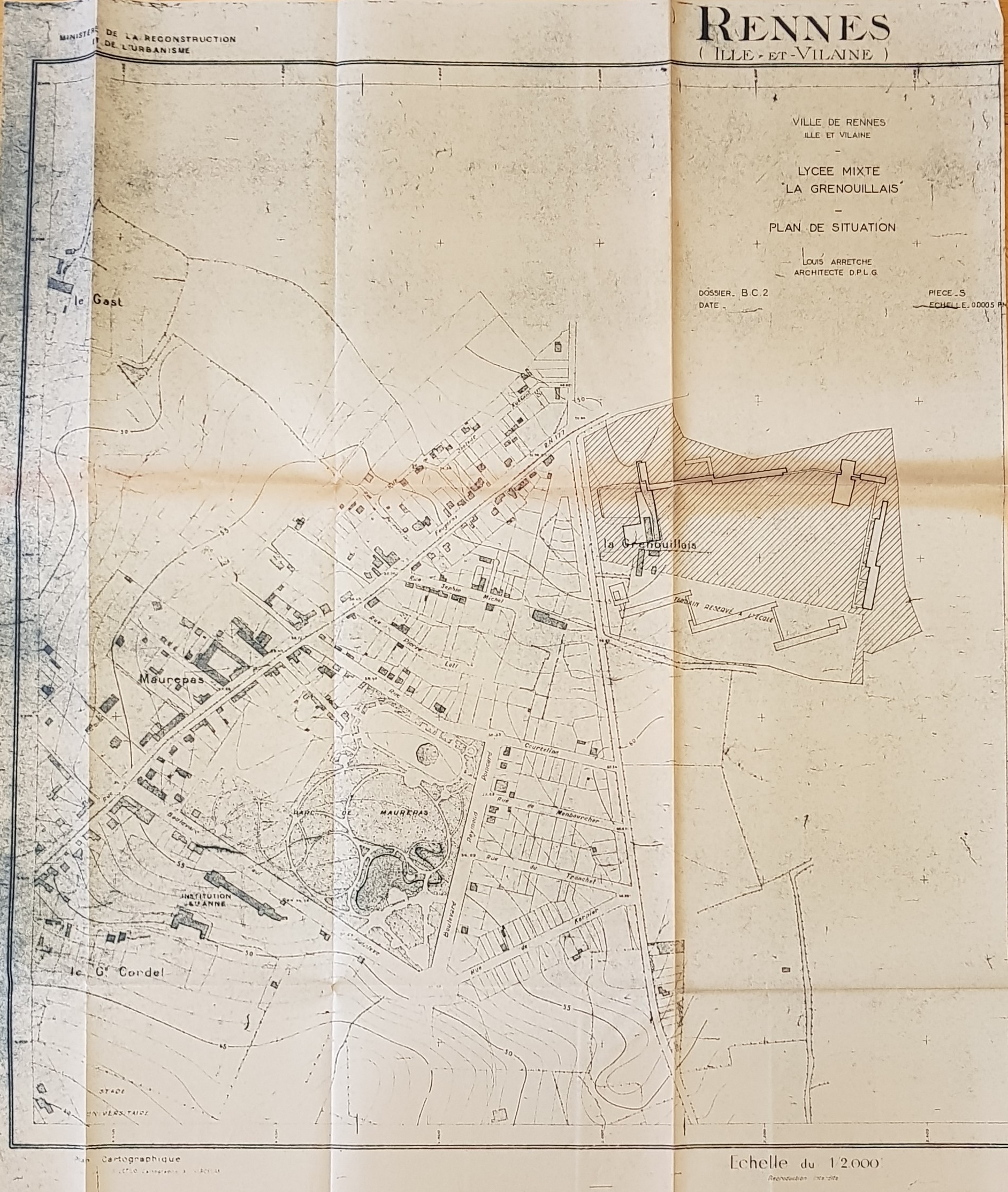 Lycée mixte de la Grenouillais. Plan de situation. Louis Arretche, architecte, sd. Le lycée Chateaubriand est implanté, in fine, au sud de la parclle de "terrain réservé à l'école".Immatriculation