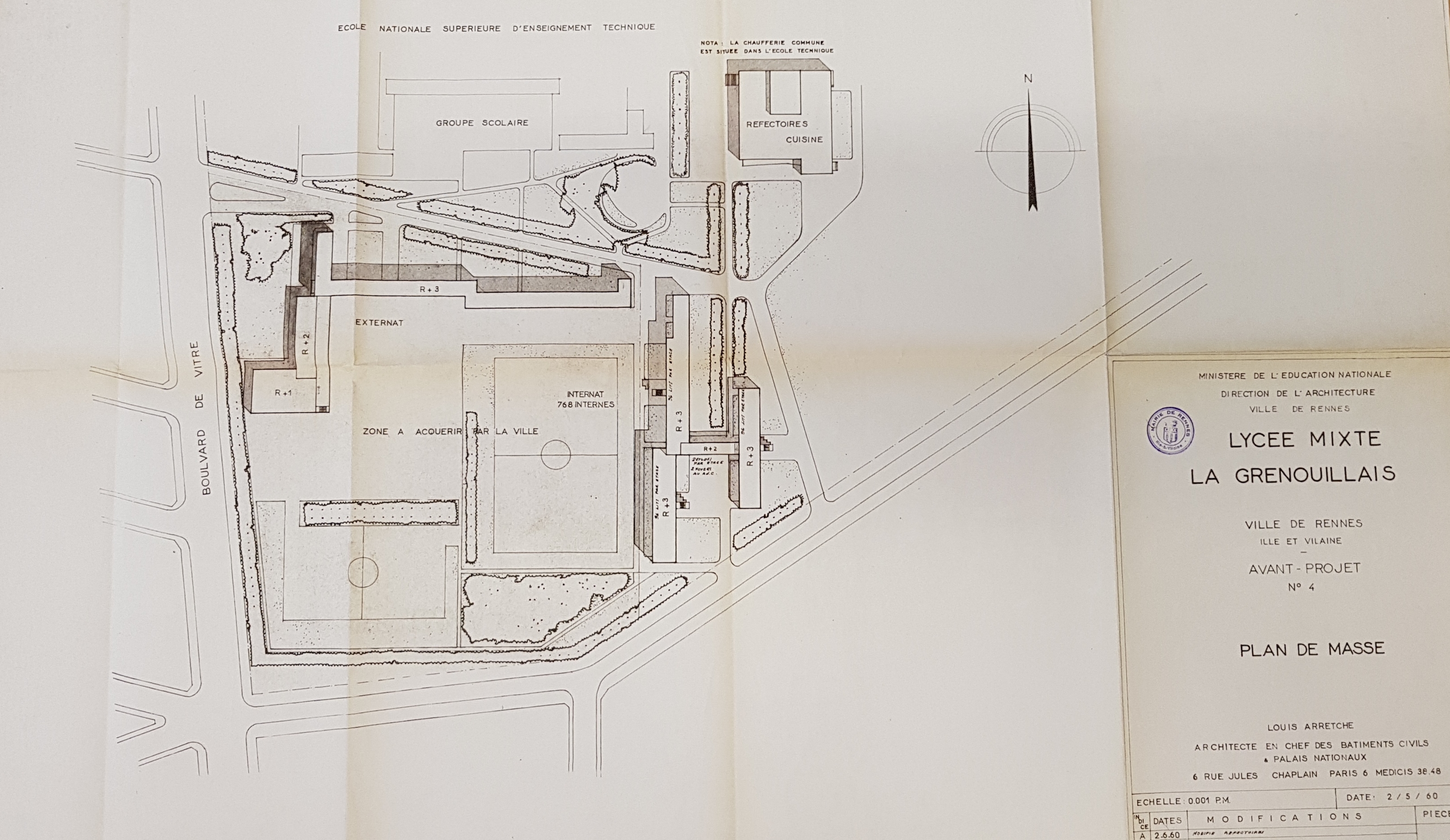 Lycée mixte La Grenouillais, plan de masse. Louis Arretche, architecte, 1960. Ce plan d'avant-projet présente pour l'essentiel les dispositions retenues in fine. Il situe bien le futur lycée Chateaubriand sur son site de construction, au sud d'un groupe scolaire qui sera remplacé par un collège.Immatriculation