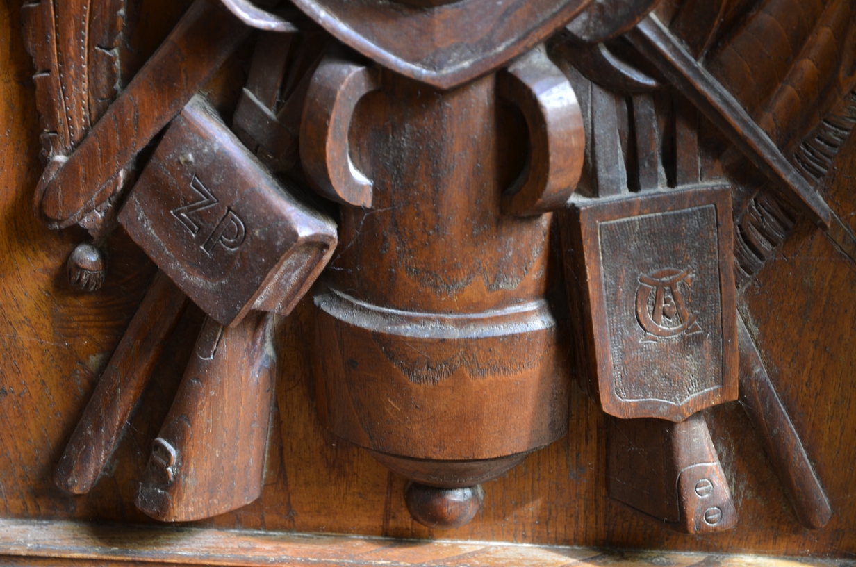 Détail du trophée d'armes de l'antependium : Initiales du zouave pontifical Athanase de CharetteImmatriculation