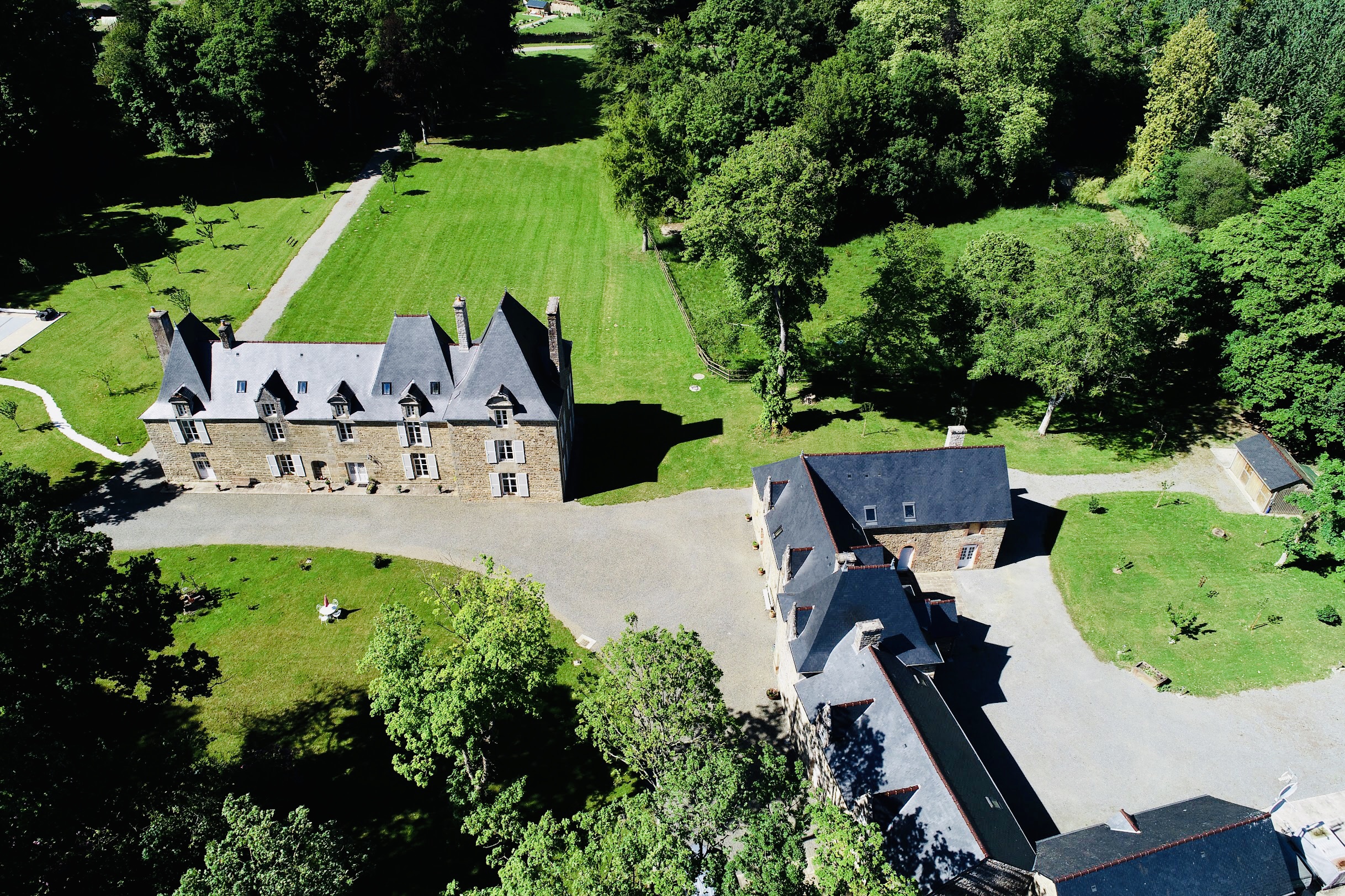 Vue aérienne du château et de ses dépendances.Immatriculation