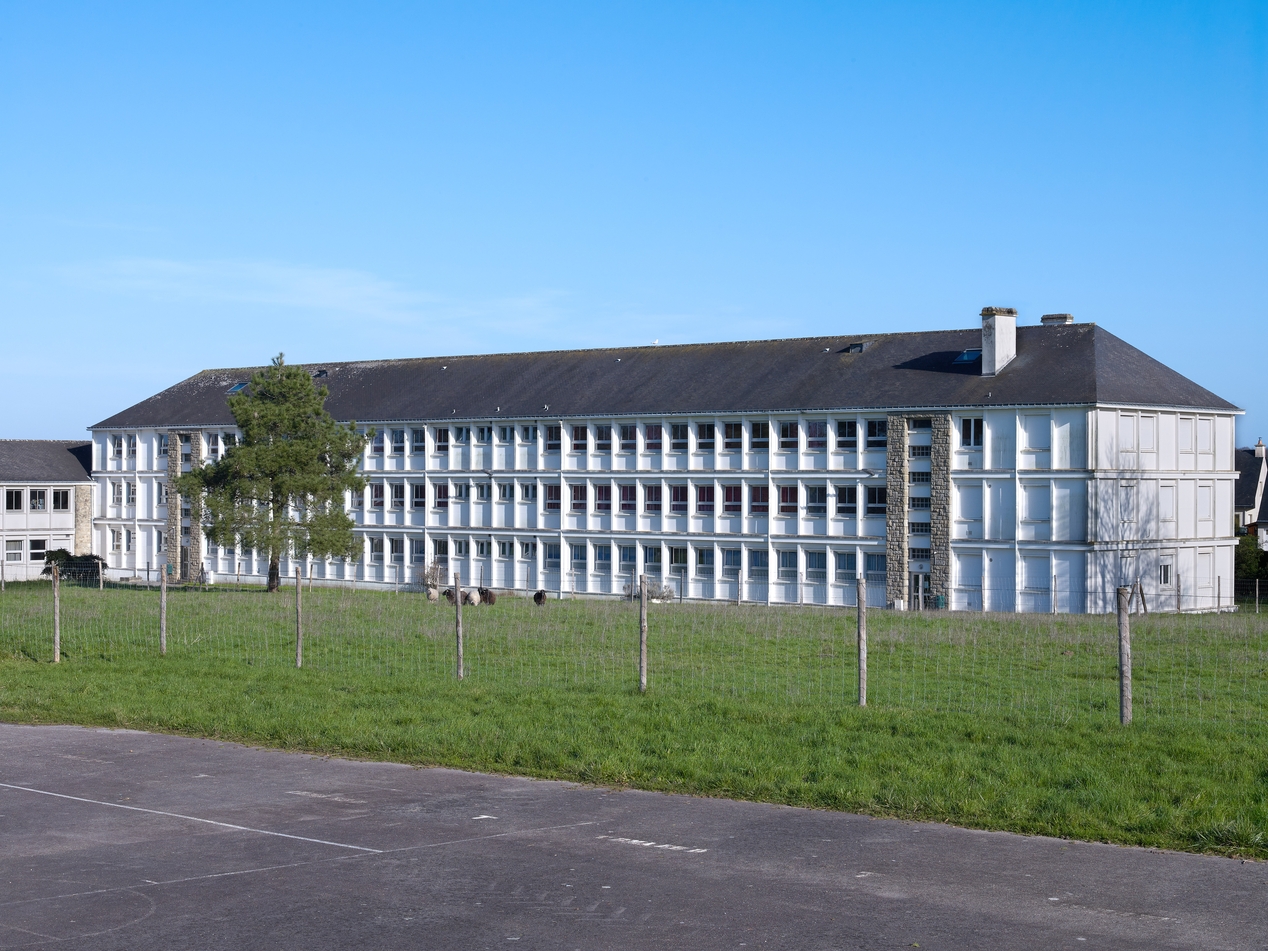 Vue d'ensemble de l'internat, façade ouest et pignon sud, noter le parement en pierre de granite du pignon et de la travée de l'escalier (Yves Guillou, architecte, 1962).Immatriculation
