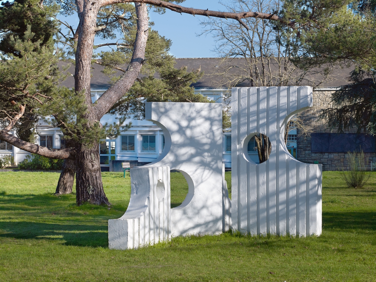 Sculpture abstraite, sans nom, en béton, réalisée par des élèves encadrés par leurs professeurs de sculpture, MM. MM. Yannick Huiban et Joël Le Priellec, vers 1978.Immatriculation