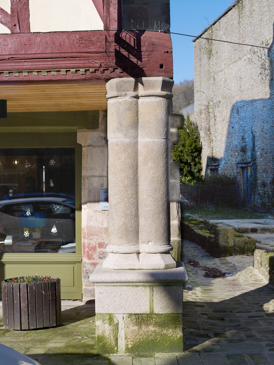 Détail du pilier en pierre en forme de colonnes accolées.Immatriculation